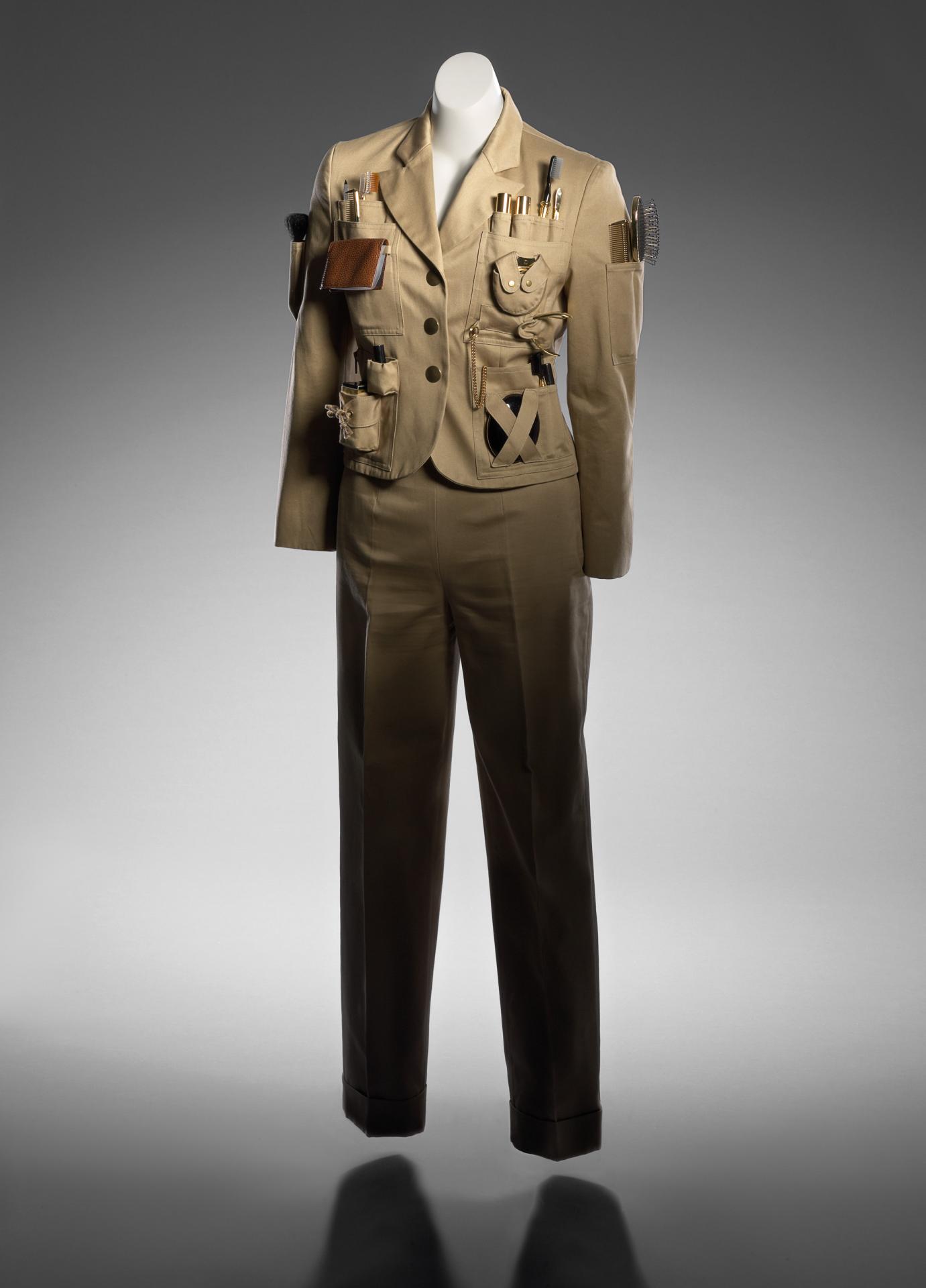 Survival jacket takes the classic khaki safari jacket with its multiple pockets to make a pun on life in the urban jungle. In this instance, the essential tools for survival include an assortment of shiny, gilded beauty aids such as a mirror, compact and nail file, as well as dispensers, brushes and combs for hair, blusher, lipstick, mascara and nail polish. A tiny compartment securely holds a boxed vial of Moschino perfume. Finally, and most prominently, there is a wallet for holding an assortment of credit cards. Not wanting us to miss the point, Moschino stencilled the words ‘survival jacket’ in bold black letters across the back. Survival jacket is reminiscent of late 1930s works by Dalí, of naked bodies conveying open drawers stuffed with objects, as well as the subsequent suits and coats by Schiaparelli featuring pockets imitating drawers.