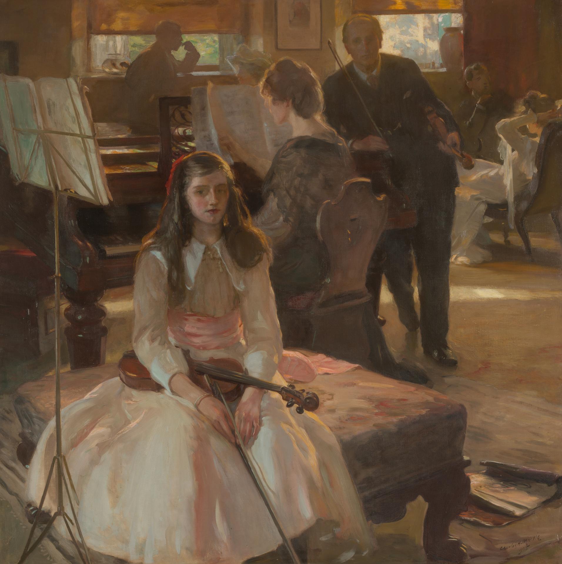 A large and complex painting first shown at Thomas Agnew’s and Sons in London in 1906, Charles Mackie’s Musical moments, 1905, is indebted to the artist’s study of Diego Velázquez’s Las Meninas (The ladies-in-waiting), 1656 (Museo del Prado, Madrid), which Mackie had copied in Madrid in 1904. The setting is probably the Waddell School of Music in Edinburgh, founded in the late 1870s by the balding violinist in the middle distance of Mackie’s composition, William Waddell, who appears with his wife Patricia Jessie Macnee seated at the piano. Their daughter Mary Elizabeth (Maimie), who later took over the running of the school with her sister Ruth, is the elegantly dressed seventeen-year-old seated at the front left, her violin resting gently in her lap between lessons.