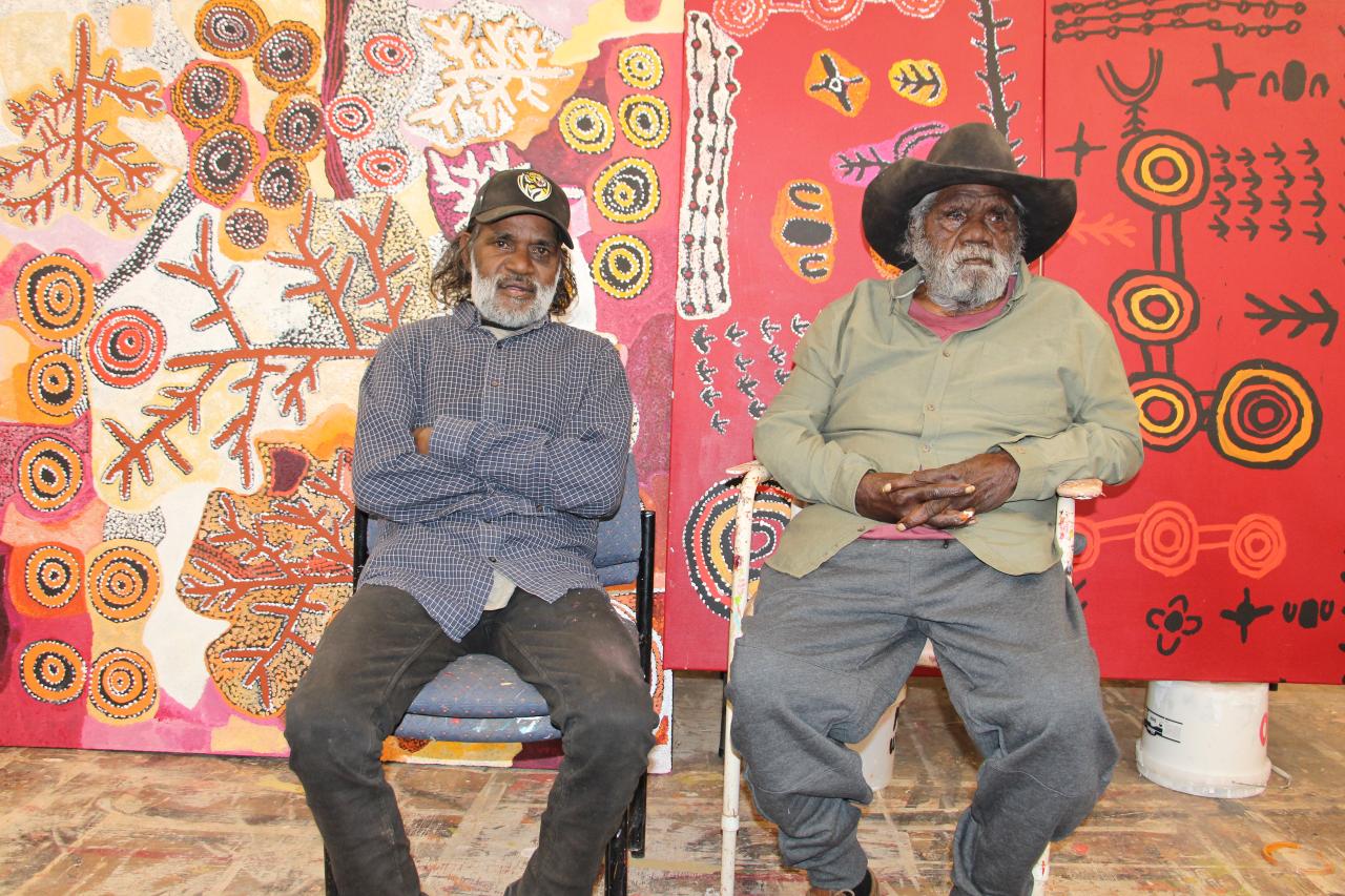 The strength of story and the practice of cultural protocol is central to Alec Baker and Eric Barney’s two collaborative paintings titled Ngura (Country). Barney is a younger artist who paints in the proper way under the cultural mentorship of Baker, a senior lawman, and both are mentored by Vincent Namatjira for this commission. This important way of working collaboratively is vital to the continuation of painting of Tjukurrpa (ancestral dreaming). Namatjira comments that through the exhibition the artists are ‘bringing their Country to the big smoke’. Namatjira started painting at Iwantja Arts in 2011, where he has established himself as a subversive and witty portraitist. In 2020 he was the first Indigenous artist to win the Archibald Prize.