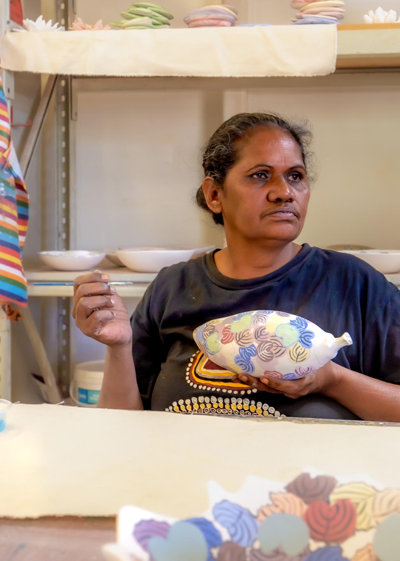 Peggy Griffiths identified the potential of My Country to share cultural and artistic practice and thus chose to mentor her daughter, Jan Griffiths. Both are Miriwoong women from Kununurra in the East Kimberley. Peggy is the first Indigenous artist to win the prestigious Fremantle Print Award and is a highly respected senior artist at Waringarri Aboriginal Arts, teaching other artists as well as contributing to leadership in a director role. The native gerdewoon (boab tree) underpins the premise of Jan’s work. A source of nourishment – from the boab nuts to the water in its hollow trunk – as well as being central to birthing and to stories relating to Miriwoong being and knowing, the multiplicities of gerdewoon as personally and culturally sacred elements are reflected in Griffiths’s work for this commission. Her installation encompasses ceramics, painting and poetry. The experiential quality of the work presents a sacred story, holding knowledge passed down from her old people.