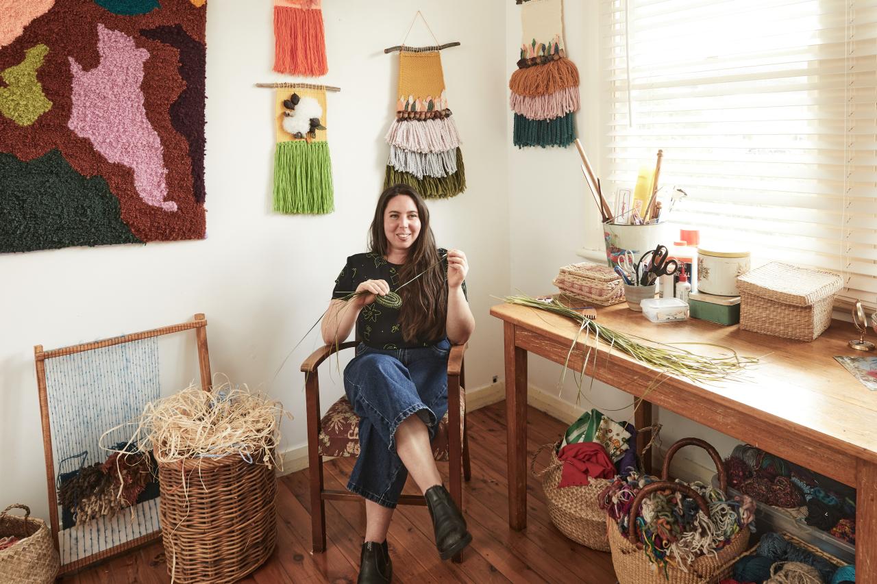 Sophie Honess, a Gamilaroi woman living and working on Gomeroi Country in Tamworth, New South Wales, embraced the challenges of translating her Country through her textile and weaving practice, working within the medium of wool to realise her largest tapestries to date. Her mentor is Wiradjuri and Kamilaroi contemporary artist Jonathan Jones. Working across a range of mediums, from printmaking and drawing to sculpture and film, Jones has exhibited nationally and internationally since the late 1990s, utilising everyday materials in minimal repeated forms to explore and interrogate cultural and historical relationships and ideas from Indigenous perspectives and traditions. Jones identified Honess’s work as offering critical insight into ‘pastoral expansion being the primary motivation for the forcible removal and dispossession of Koorie peoples from our country and the destruction of our culture’. Honess’s three tapestries for My Country represent Daruka in Gomeroi Country, each panel reflecting a different environmental feature – the grasses, the creek beds and the sands. Through research that involved going out on Country with knowledge-holder Marc Sutherland and cultural mentor Amy Hammond, Honess has developed a visual language of textures, tones and colours that connect to the layers of Country. Through tufting and latch hooking over 86,000 wool knots into a grid mat, Honess charts the beauty of her Country, which deserves to be appreciated and looked after.