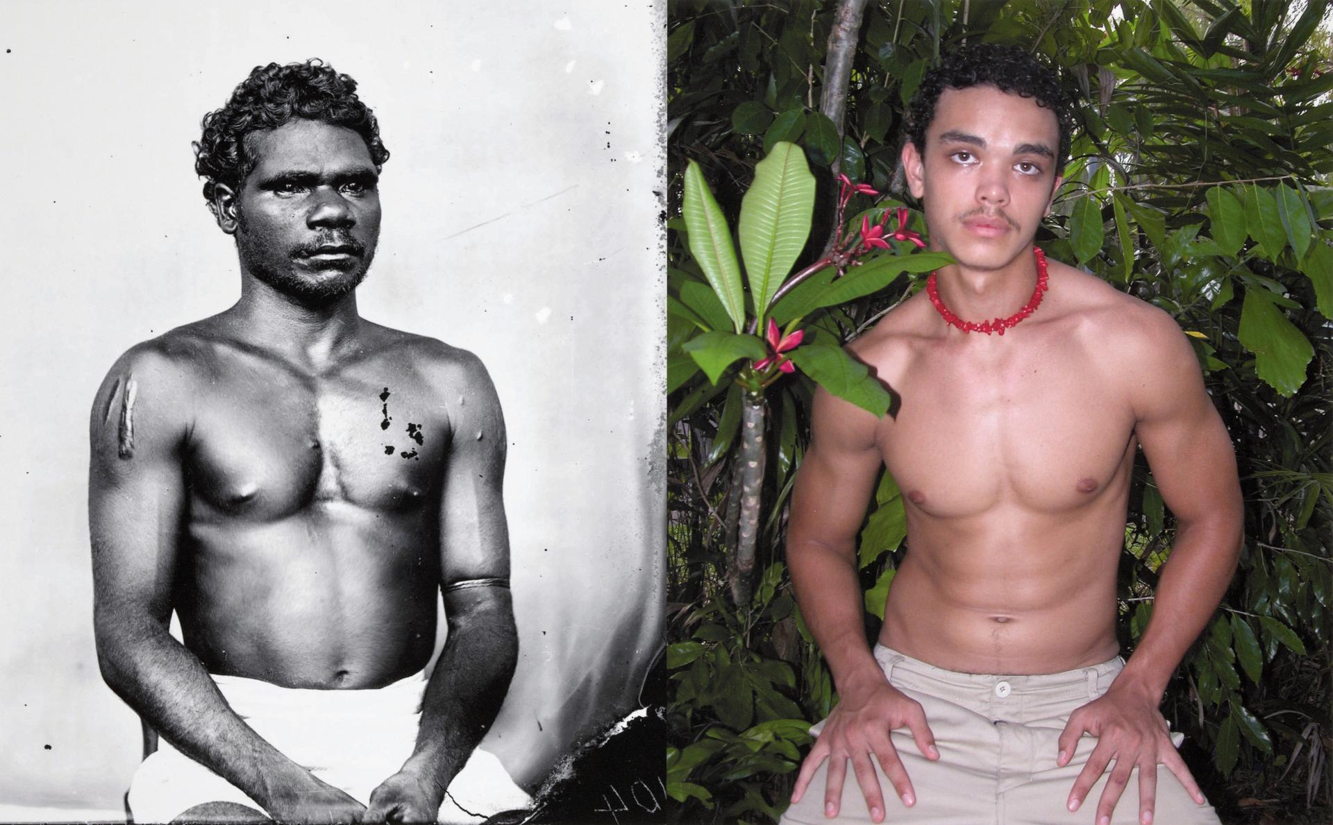 This work bookends multiple others in which Lee has taken the archive itself as source material. In works such as Billiamook and Shannon, 2023, and Mei Kim and Minnie, 2023, the pairing of contemporary and archival photographs visualises an ancestral connectedness that will not be disrupted. In Billiamook and Shannon, Foelsche is removed from the narrative – unnamed. Rather, the diptych crafts a temporal, aesthetic and ancestral dialogue between Lee’s nephew, Shannon, and ancestor, Billiamook. Lee starkly contrasts the minimalist stage space of Foelsche’s portrait – the clinical, ethnographic sheet removed – and places Shannon in situ. Shot on Larrakia Country, both works have a relational connection. By positioning Shannon within the native flora of Larrakia Country, Lee offers a sense of reconciliation to Billiamook, the archive now enlivened with energy.