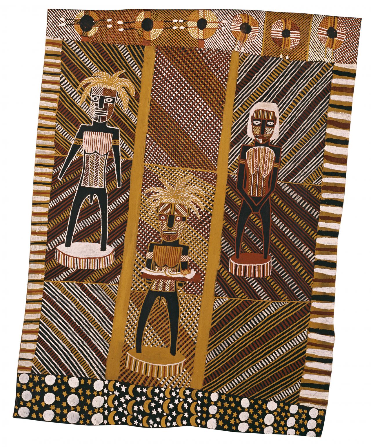 Yet in terms of traditional Tiwi aesthetics this painting reflects a society increasingly acculturated and removed from the art of parents and grandparents. The clear differentiation between subject and decoration – where a naturalistic image (here the ancestral heroes are portrayed as contemporary wooden sculptures) is superimposed on an unrelated, patterned background – is very recent in Tiwi art. Equally, the predominating use of geometrically precise cross-hatching, nowadays regarded by Tiwi people as epitomising their traditional art, appears only rarely in earlier designs. Such cross-hatching features particularly in Tiwi art produced on Bathurst Island at the old mission settlement of Nguiu, where Harold Porkilari grew up. Although the reasons for this have still to be thoroughly researched, it seems likely that the use of cross-hatching is directly connected with the Roman Catholic mission’s active discouragement, and banning, of ceremonial life. This ban lasted many years, and it appears that during this period many of the older-style motifs, still found on Melville Island, were lost from the Bathurst Island repertoire. Further to this, increasing communication and intermarriage with the people of the mainland has had an influence on younger artists, in terms of the lineal designs of Arnhem Land Yolngu painting.