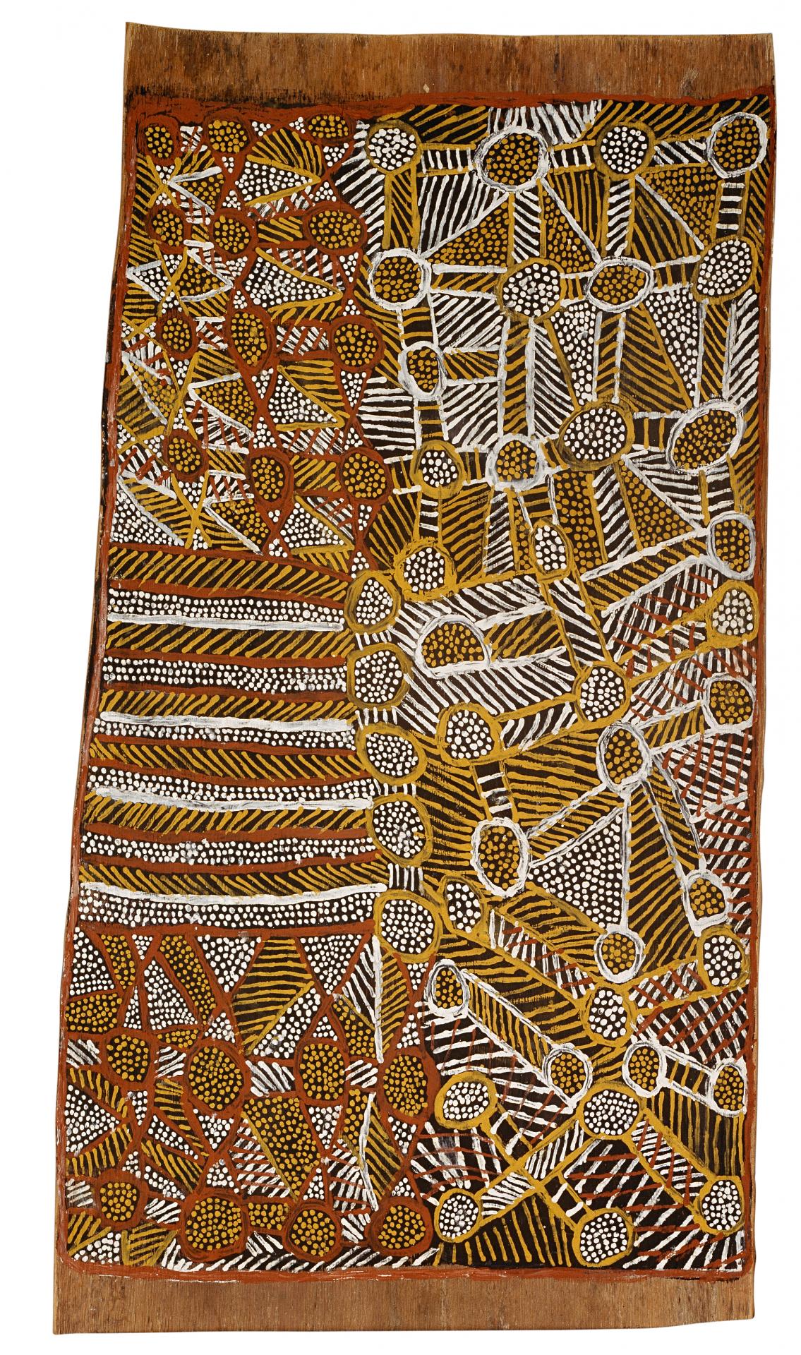 Many of Kitty Kantilla’s paintings are derivative of designs representing ceremonial body-painting for yoyi – designs that she formerly applied to the carved figures and funeral poles she made when younger. Any adaptation of these designs in their new context appears to involve changes in format rather than alterations in symbolic meaning – for example, the predominantly vertical lines of pwanga dots applied by the artist to elongated graveposts assume a horizontal alignment on the rectangular barks.