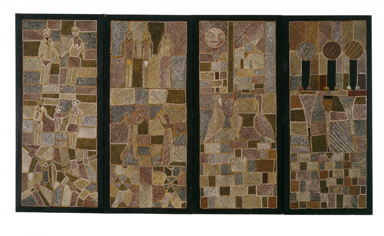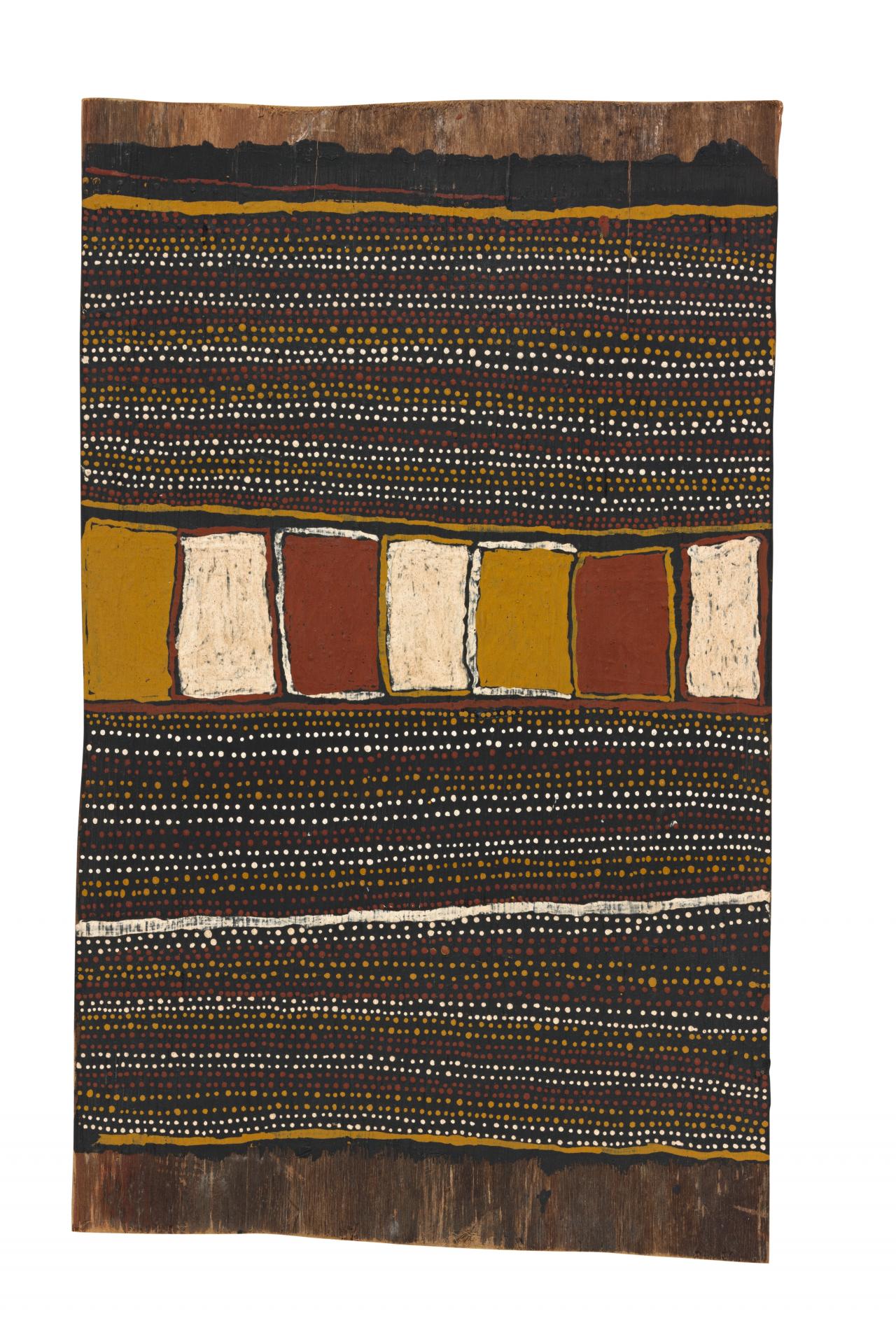The fourth panel, depicting ritual objects associated with the pukamani ceremony, no longer provides a figurative narrative but is a metaphor for the whole Purukuparli story. Among the three pamijini armbands and yirriwala fighting sticks used in the widows’ dance is a forked fighting stick, an allusion to the argument between Purukuparli and Taparra the Moon. The unexpected exposure of three prominent areas of black ground has no inherent meaning beyond being an idiosyncratic pictorial device commonly used by this artist.