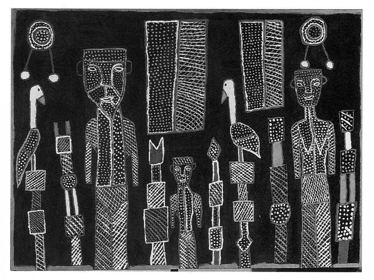 It is essential in this connection that black artists speak for themselves to determine the agenda for the interpretation of their art. This is not a mandate for us to subsequently adjust this information to fit white frames of reference more comfortably. By contrast with our society, Aboriginal culture values far more non-spoken, as distinct from spoken, modes of communication. Despite the rapport that has developed over several years between Jean Baptist Apuatimi and the author, the artist has remained reticent as to her own interpretation of the painting discussed here. The obvious enthusiasm felt for the commission was expressed in the actual act of painting, not in talking about it, before or after.