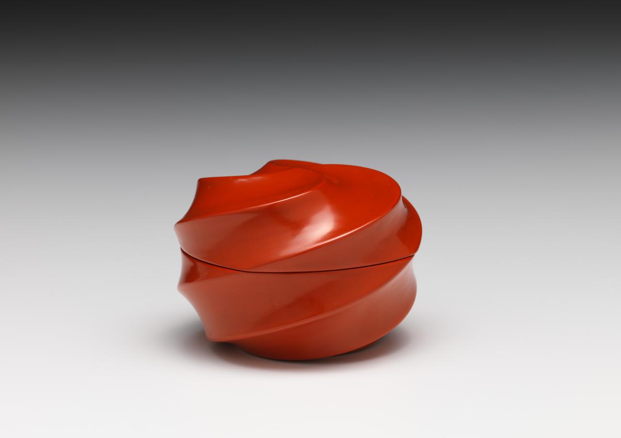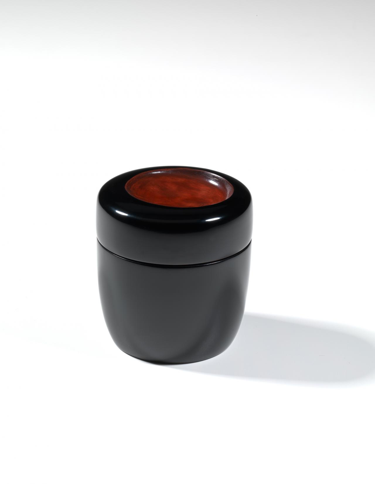 A similar fusion of lacquering philosophies displayed in the sixteenth-century Daikogō and the profound ambience of Negoro continues to influence Japanese lacquer artists to this day. The Four edged Kamakura tea caddie produced by acclaimed living national treasure Kuroda Tatsuaki during the 1960s challenges our understanding of a four-edged object and engages in a creative dialogue between the artist’s contemporary practice and the ancient techniques of both Kamakura-bori and Negoro lacquer. Contemporary artist Michiko Suganuma operates from the lacquer-producing area of Kamakura and works exclusively in the traditional radiant palate of Negoro. Her streamlined Kappa style tea caddie in hues of black and deep red is produced with layers of lacquer on a bamboo base. The indentation of the bamboo joint on its lid playfully references the Japanese mythological river creature known as the Kappa that has a dish-like indentation on its head and can only leave a river when the indentation is filled with water.