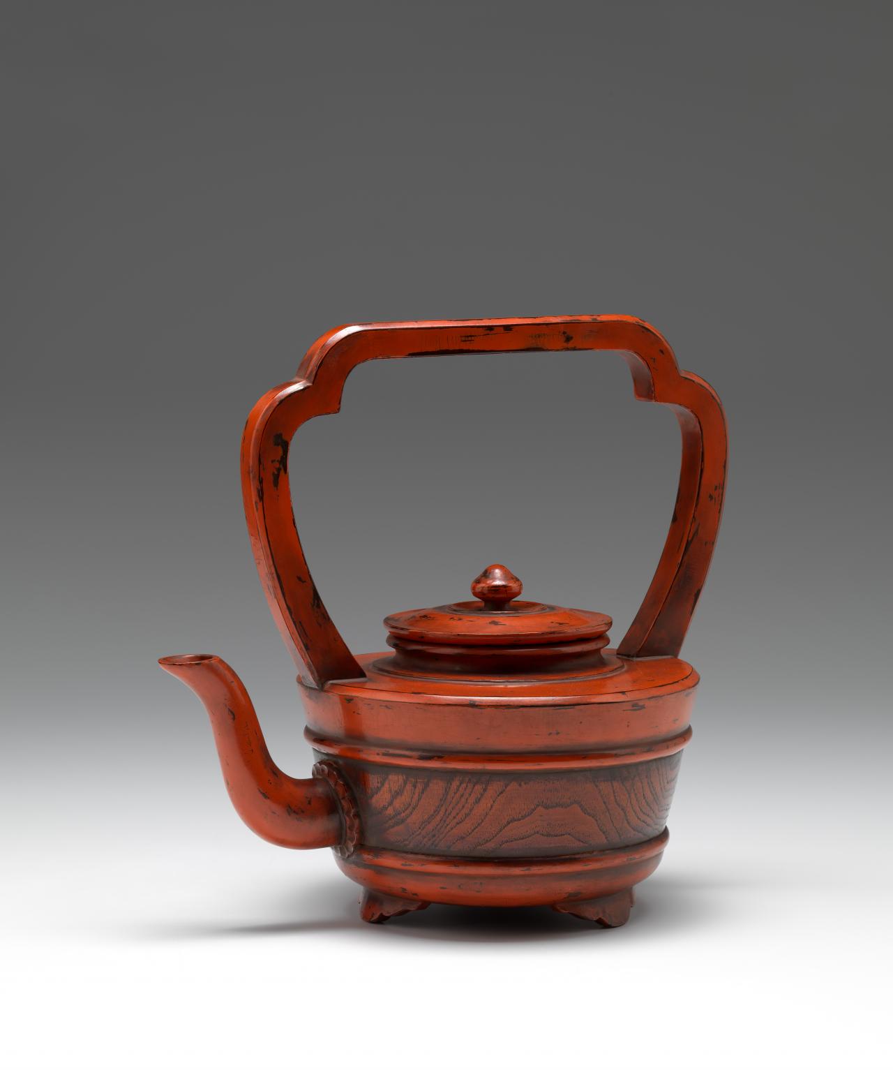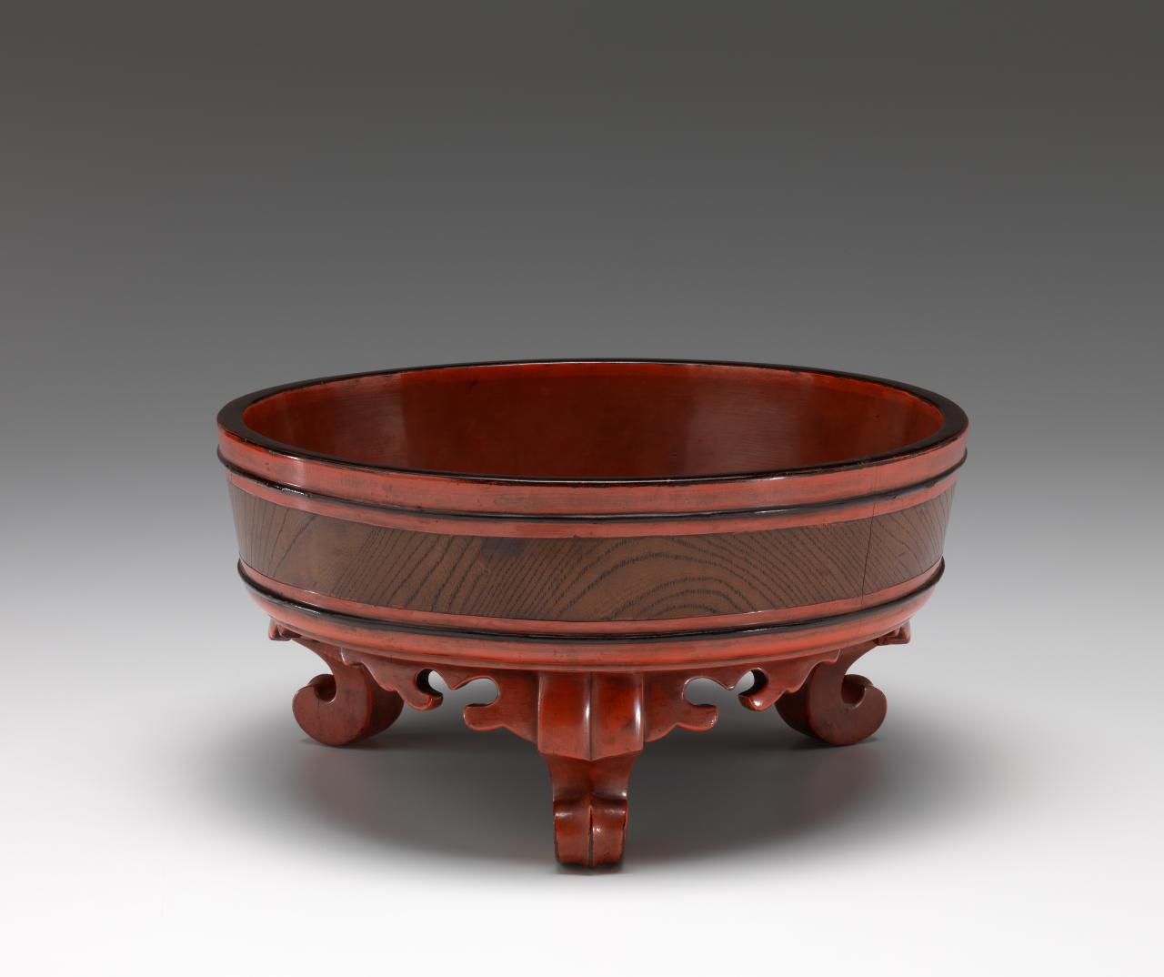 In these depictions of monastery life and aristocratic villas Negoro utensils are clearly shown as favoured and cherished objects, alluding to demand for their production in large numbers. Square and circular trays, bowls of various sizes and large spouted ewers were used at daily meals. Lobed cup stands, offering trays and sake bottles with foliate lids featured in temple rituals and clearly display lotus flower–inspired motifs common to Buddhist art. Stem tables were frequently used as offering stands and placed in altars of Buddhist temples and Shinto shrines. Circular wash basins with legs were used in monastery ceremonies to catch water poured over the hands of monks in an act of purification. Large hot water pots or spouted ewers were often used as practical kitchen and serving utensils, and are still used to this day in Zen monastery dining halls to serve hot water that monks swill their bowls with, consuming every last grain of rice in adherence to Zen eating etiquette. The makers of the hot water pot and two wash basins in the NGV collection have used a technique that takes advantage of the objects’ natural wood grain. The decorative band of warm, wood texture left visible in each object complements its smooth, sensual lacquered surface and subtly enhances its overall appearance.