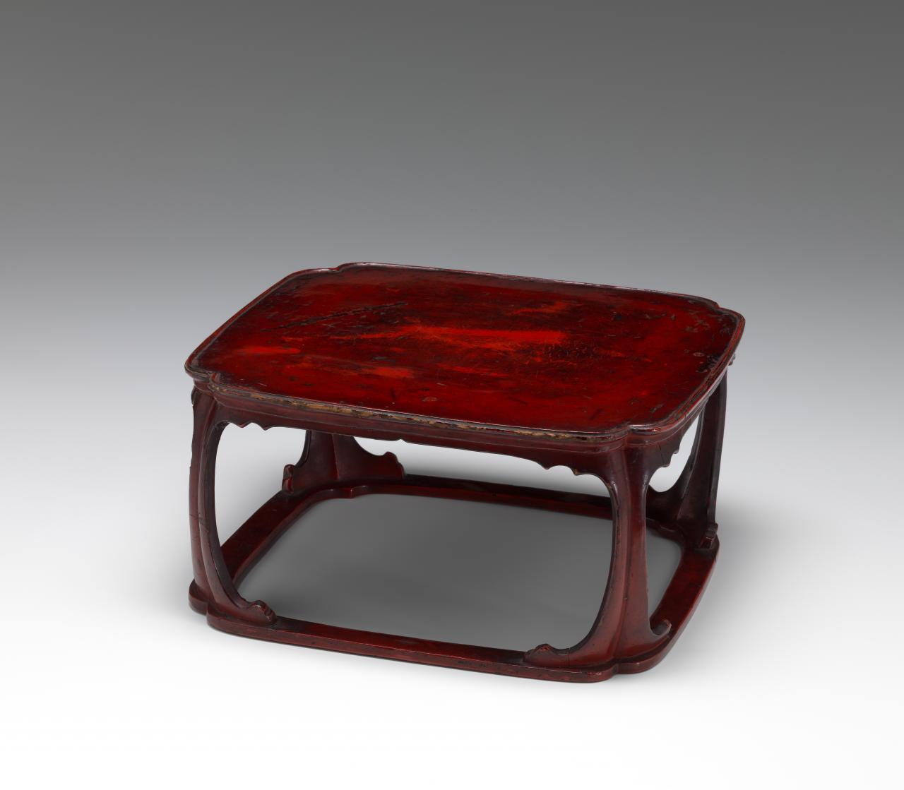 By the late sixteenth century Negoro-ji temple had attained great social influence, economic strength and had even embarked on the production of firearms modelled on matchlock muskets recently introduced to Japan by the Portuguese. The always strategic and ever suspicious ruling lord of the time, Toyotomi Hideyoshi, felt threatened by the Buddhist enclave and in 1585 embarked on a campaign to subdue its power, burning all but three of its worship halls to the ground. This defining moment in Japanese history and accepted end date for the production of historical Negoro lacquer is embodied in the centrepiece to the NGV’s display: the recently donated Nobleman’s meal table, which bears an inscription dating it to the exact year of this devastating event. Scholars speculate that the elegant contours of the table’s side openings and legs, as well as its compressed overall form that differs from other meal tables of the sixteenth century, indicate that this rare piece was produced at a much earlier date during the Kamakura period (1185–1333) and given the inscription ‘Thirteenth year of Tenshō (1585), Murō-ji temple, Yamato no kuni’ (present-day Nara Prefecture) at the later date of 1585.