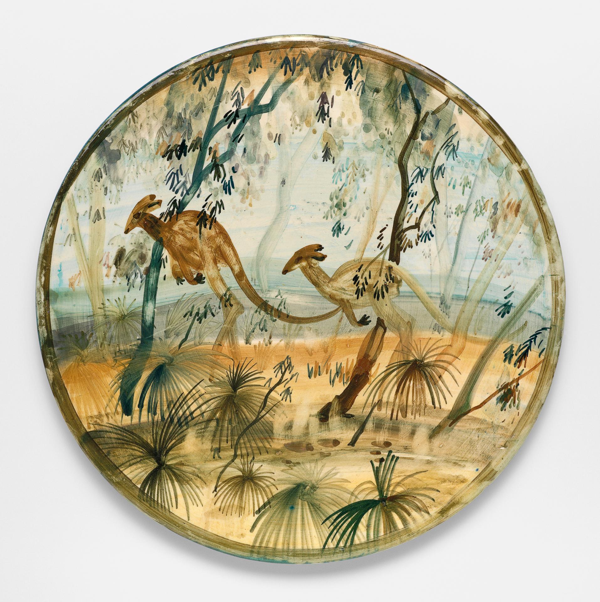 Kangaroo platter, c.1950, is an excellent example of Douglas’s practice of this time. It is wheel-thrown glazed earthenware with a painted underglaze image of kangaroos in a bush setting composed with grass trees and eucalypts. The form, a simple plaque, and the scene, deftly painted but poetic, are characteristic of Douglas’s style. Formerly in the collection of Gora Singh Mann, Sydney, Kangaroo platter was recently acquired by the National Gallery of Victoria, along with three other fine pieces by Douglas, from a prominent Melbourne collector.