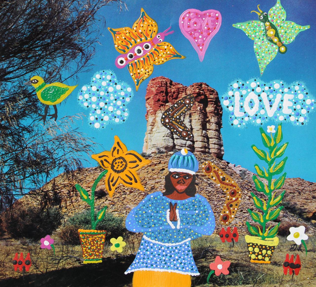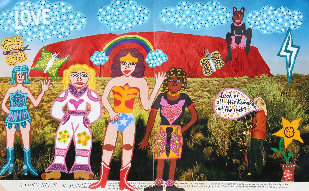 The acquired work is a series of ten paintings produced on found tourism magazine pages, featuring Whiskey’s signature characters from popular culture, including Cher, Catwoman, Tina Turner and Sandy from Grease. They are dazzling and fun, and like Whiskey herself who grew up with Coca-Cola and TV, but also tjurkurpa (ancestral stories) and bush tucker, they combine symbols of life in the desert with internationally familiar iconography. The background photos are shiny and airbrushed, originally created as alluring images of remote Australia, destined for the coffee tables of consumers and tourists. Like colonial paintings that sold false narratives of Australia’s peaceful settlement to those far removed from its reality, in the tourist photos, Indigenous presence is absent. Whiskey fills this absence, inserting strong female figures, and in one instance, herself, into the landscape, declaring contemporary First Nations culture as spirited, powerful and – above all – present.