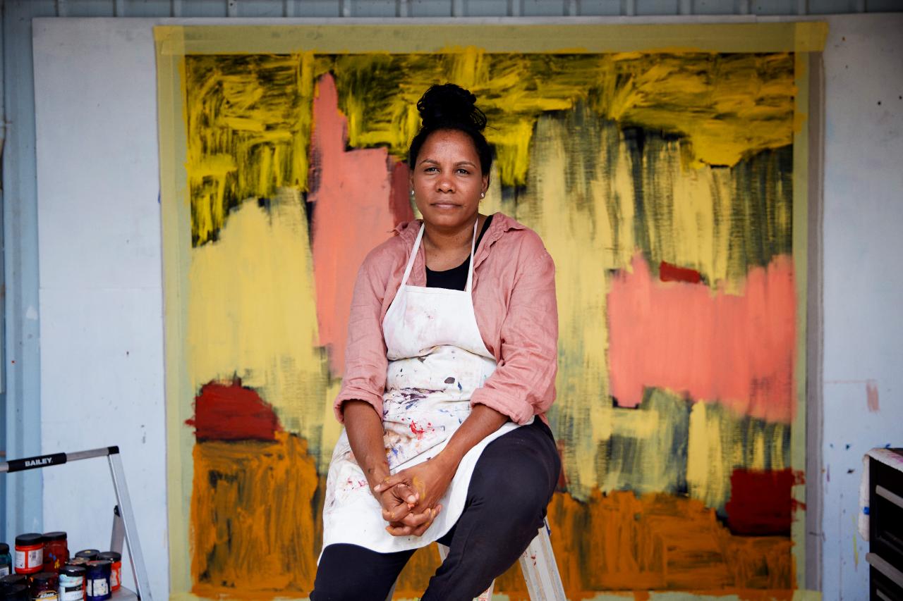The painting acquired with the support of MECCA is titled Deeper, 2020, and was inspired by Hobson’s observations of colour in the media throughout 2020. Hobson has always connected colours with places and stories. The year of 2020 was defined (among other things) by the COVID-19 pandemic, the global Black/Blak Lives Matter movements and protests in Australia demanding action on Aboriginal deaths in custody.