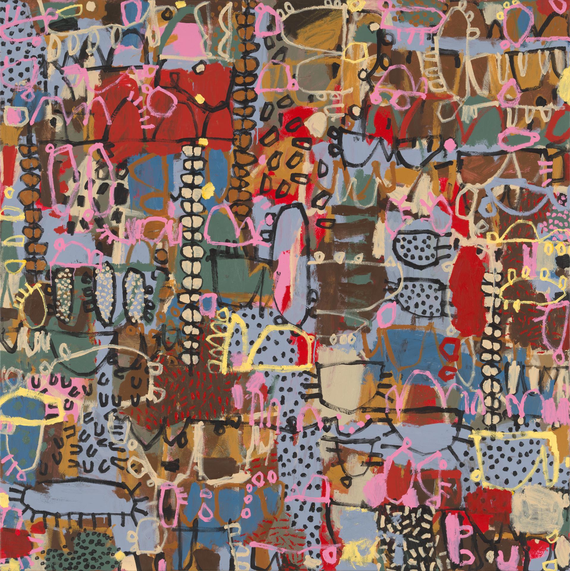 Hobson’s formative paintings were characterised by flat blocks of colour and linear designs repeated to form flat, colour field compositions. In recent years, her paintings have increased in visual complexity, now filled with intertwined, curving lines, rich textures and layers of vibrant colours. She uses the creative freedom of painting as an emotional outlet to explore all aspects of the landscape, from the smallest grains of sand found along a riverbed, to the tangled limbs of glossy ghost gums after rain. She is inspired by spending time out on Country. For Hobson, it is this that grounds her, as she says: