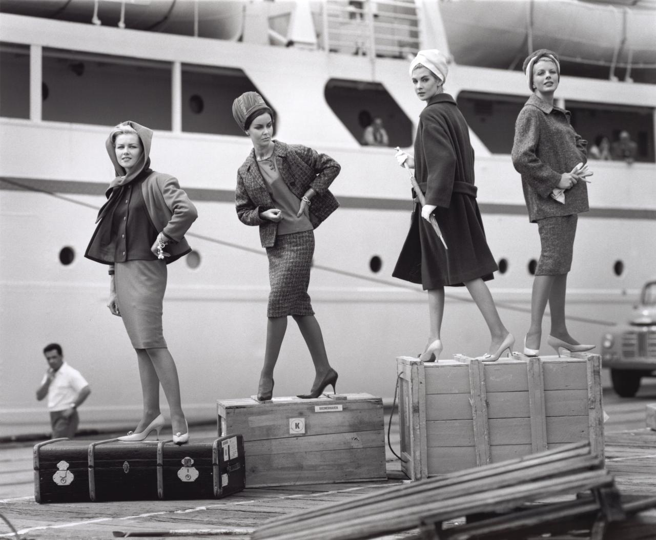 Benini’s work is characterised by a cold elegance and a European ‘look’ that appealed to Collins Street couturiers, including Pat Rodgers of La Petite and Hall Ludlow. In 1957 Benini was commissioned by Hall Ludlow to photograph the garments in his collection. In a striking example, Fashion Illustration, Model Bambi Shmith, University of Melbourne, 1957, Benini uses the elegant modern architecture of the University of Melbourne as a backdrop to emphasise the thin line of this unusual dress trimmed with bows. The disdainful gaze of the famous model Bambi Shmith further reinforces the sense of refinement and elegance at the base of Ludlow’s models.
