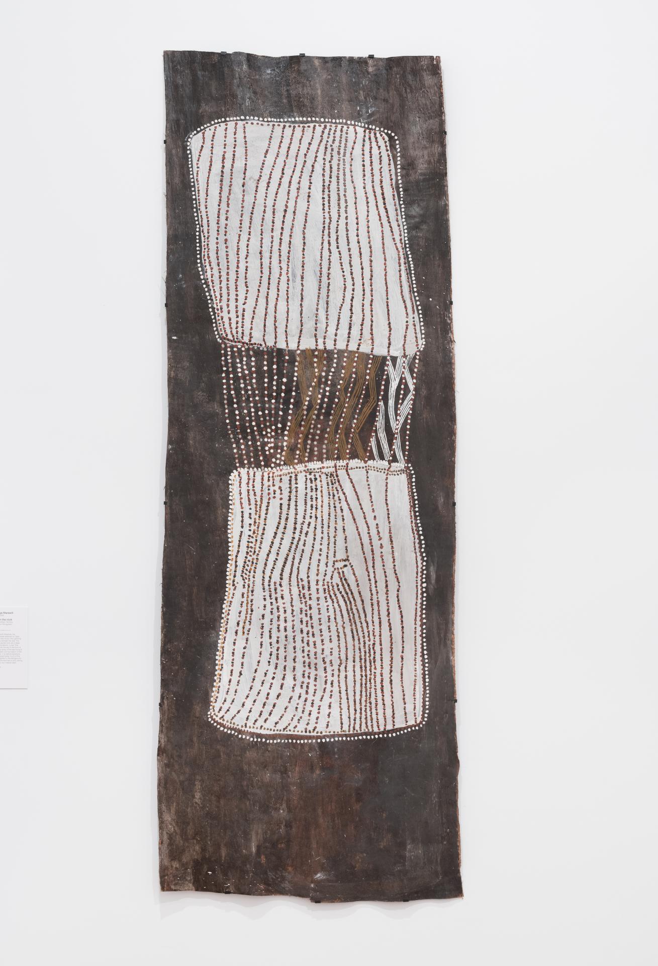 This recent work marks an aesthetic shift in Nonggirrnga’s rapidly developing oeuvre and a point of departure from many other known forms of Yolngu bark painting. The artist has stripped away much of the crosshatching applied with the marwat (human-hair brush) and pared back the imagery to depart from one of the established canons of Yolngu art, namely that the ‘background’ be covered with miny’tji (sacred clan designs) rather than left plain. Intriguingly, the negative space and bold simplicity of Nonggirnga’s work approaches in form and visual power Mundukul’s work for anthropologist Donald Thomson. In 1942 Mundukul invented a language by transferring miny’tji seen on a man’s chest to the red-ochre surface of stringybark, where these white-ochre body markings float on a plain background and project across space. Although Nonggirrnga disavows any sacred intent, her Madarrpa identity underlies her practice, and therefore the echo of miny’tji, heightened by its contrast with the dark sepia background, persists.