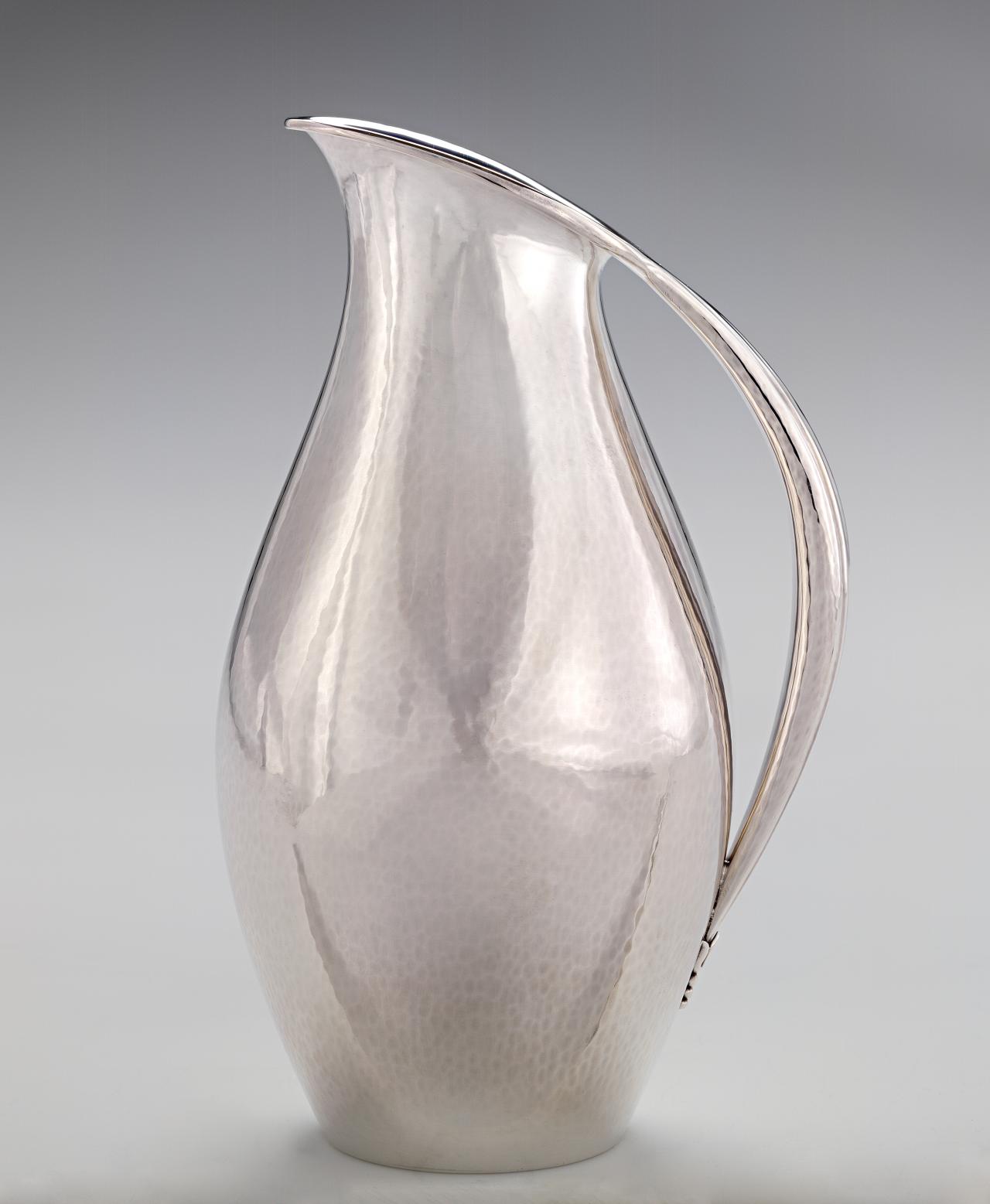 McDonnell chose well, buying directly from the manufacturers and selecting a rich variety of works that represented many of the leading designers of the day. He chose ceramics from the Swedish manufacturers of Gustavsberg and Rörstrand Porslinfabrik, and Danish works by the Royal Copenhagen Porcelain Manufactory. He bought silver from the famous Danish manufacturers Georg Jensen, A. Michelsen and Hans Hansen Sølvsmedie, and in glass he acquired significant examples of Swedish Orrefors and Finnish works by Iittala and the Nuutajärvi Glassworks. Although McDonnell only acquired two examples of Danish furniture, his foresight in recognising the importance of seating design within the context of contemporary practice is notable. Many of the works he selected are now considered design classics, including Tapio Wirkkala’s Kantarelli, vase (Chanterelle), 1946 (designed), 1946–51 (manufactured), for Iittala (below); Johan Rohde’s 1925 silver Pitcher for Georg Jensen (below); and Orla Mölgaard Nielsen and Peter Hvidt’s Ax armchair, 1950, for Fritz Hansen (below). It is curious that McDonnell did not acquire works by Norwegian manufacturers and this remains an area of the collection still to be addressed. The only Norwegian work in Nordic Cool is the Armchair designed in 1953 by Torbjørn Afdal for Bruksbo, purchased in 1961.