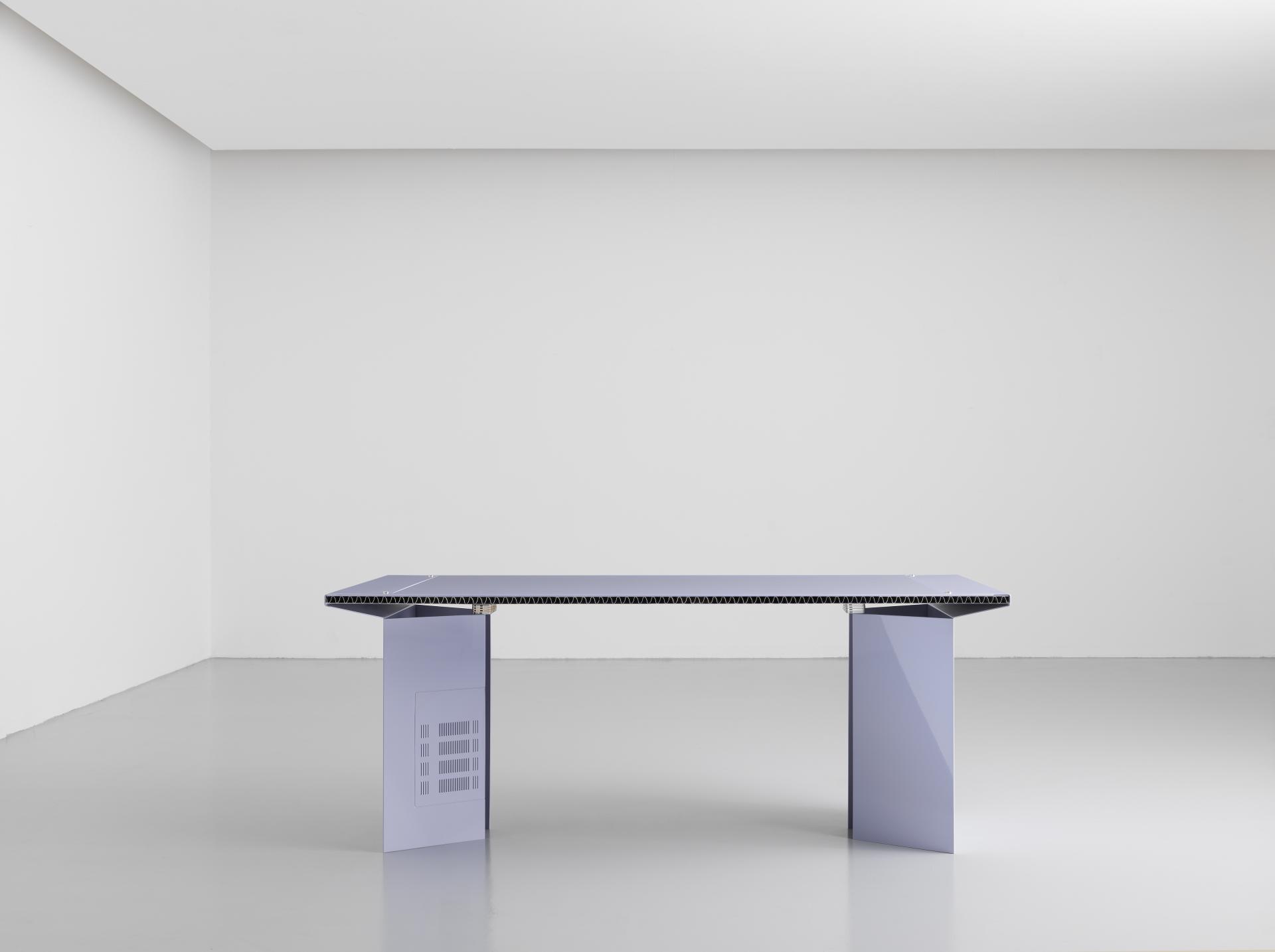 Una gamba di questo tavolo è la griglia di aerazione di un forno a microonde, mentre il piano del tavolo è sospeso su due pile di involucri esterni di telefoni cellulari. Formafantasma utilizza i materiali di provenienza di questi mobili per esplorare la questione dell'”estrazione mineraria in superficie” e il ruolo complesso che il design svolge nella trasformazione delle risorse naturali in prodotti desiderabili.