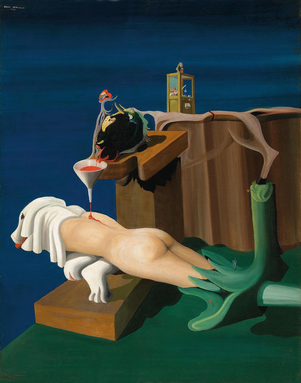 Born in 1906 on Tenerife in Spain’s autonomous Canary Islands, Domínguez was born into a farming family. He first visited Paris at the age of twenty-one in connection with his father’s banana export business, and between 1929 and 1933 he travelled regularly between Tenerife and the French capital. In 1933 he held his first solo exhibition of paintings at Círculo de Bellas Artes de Tenerife, and in Paris later that year he met and befriended the Surrealists who had formed around poets André Breton and Paul Éluard. Falling promptly under their spell and into their fold, he contributed a satin-lined wheelbarrow to their seminal Exhibition of Surrealist Objects held at the Galerie Pierre Colle in Paris in 1933. Domínguez settled permanently in Paris in 1934, and that very same year he became an official member of the Surrealist group. He thereafter contributed significantly to the Surrealist movement, both participating in and helping to organise numerous and important Surrealist exhibitions throughout the 1930s.3 His participation in, and organisation of, many Surrealist exhibitions followed: in 1935 he organised an exhibition at the Santa Cruz Athenaeum on Tenerife; in 1936 he participated in the now famous exhibition Fantastic Art, Dada and Surrealism at MoMA, New York, and in the International Exhibition of Surrealism in London at the Burlington Galleries (organised by Roland Penrose). Domínguez would remain in Paris until his suicide in 1957. See ‘Óscar Domínguez’, Museu Coleção Berardo, http://en.museuberardo.pt/collection/artists/165#sthash.cHFefw1I.dpuf (accessed 21 March 2016); and ‘Óscar Domínguez’, Oxford Reference, Oxford University Press, <http://www.oxfordreference.com/view/10.1093/oi/authority.20110803095725892> (accessed 29 March 2016)..