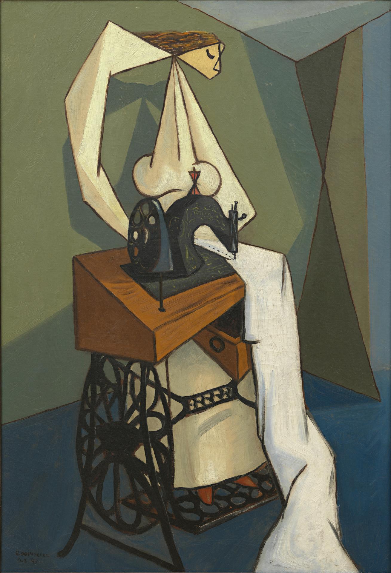 Unable to secure an exit visa, Domínguez was forced to return to Paris in the spring of 1941. In the void left in the French capital after the departure of most of the avant-garde, he forged intimate friendships with Picasso and Éluard, who also remained in France during the war. The works shown in Domínguez’s first solo exhibition in Paris, held in at the Galerie Louis Carré in 1943, illustrated the profound influence of both Éluard and Picasso on the artist. First shown at this exhibition (and later acquired by Éluard for his personal collection), La couturière shows Domínguez’s sourcing of Surrealist iconography and ideology, but also the distinct transformation in the style of the artist’s work that took place after his return to the French capital – geometric forms and strong lines found in Picasso’s oeuvre also became prominent in Domínguez’s work throughout the 1940s.24 ‘Óscar Domínguez’, Museu Coleção Berardo, <http://en.museuberardo.pt/collection/artists/165>, accessed 24 Jan. 2017. The painting was important to Éluard, and in 1948 the poet reproduced it to illustrate his dedicatory poem ‘Á Oscar Domínguez’ in his volume Voir. Further, Éluard wrote the catalogue text for the exhibition and later acquired the painting – one of two works by Domínguez that remained in the poet’s collection until his own death in 1952. Annick Lionel-Marie, Paul Éluard et ses amis peintres, 1895–1952, Centre Georges Pompidou, Paris, 1982, pp. 70, 100–1.