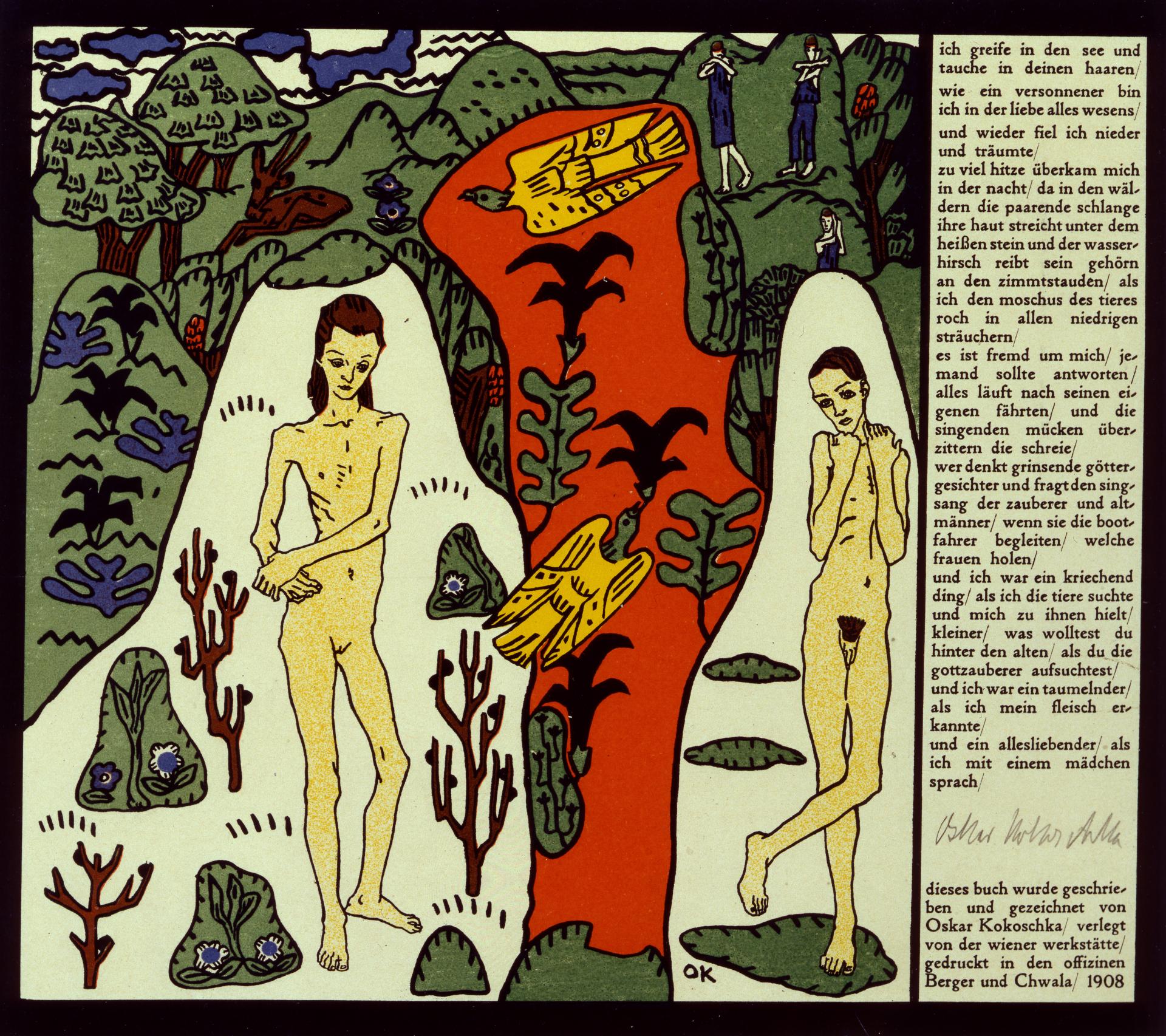 On each page the text is positioned in a vertical column alongside the image. Kokoschka was influenced by various traditions and particular artists when he designed the book. The simultaneous depiction of various moments in one image is reminiscent of medieval art, and the bold lines and bright colours of his compositions draw on traditional European folk art. The shadowless forms and stylised surface decoration reflect Jugendstil aesthetics, while the angular figures of the adolescent boy (Kokoschka) and girl (Li) on the last page – illustrated here – are inspired by the sculptures of the Belgian artist George Minne, as Kokoschka himself explained. All of these elements are integrated into a coherent and truly original artist’s book, which is prefaced with a dedication to Gustav Klimt, who had been one of Kokoschka’s teachers at the Kunstgewerbeschule.