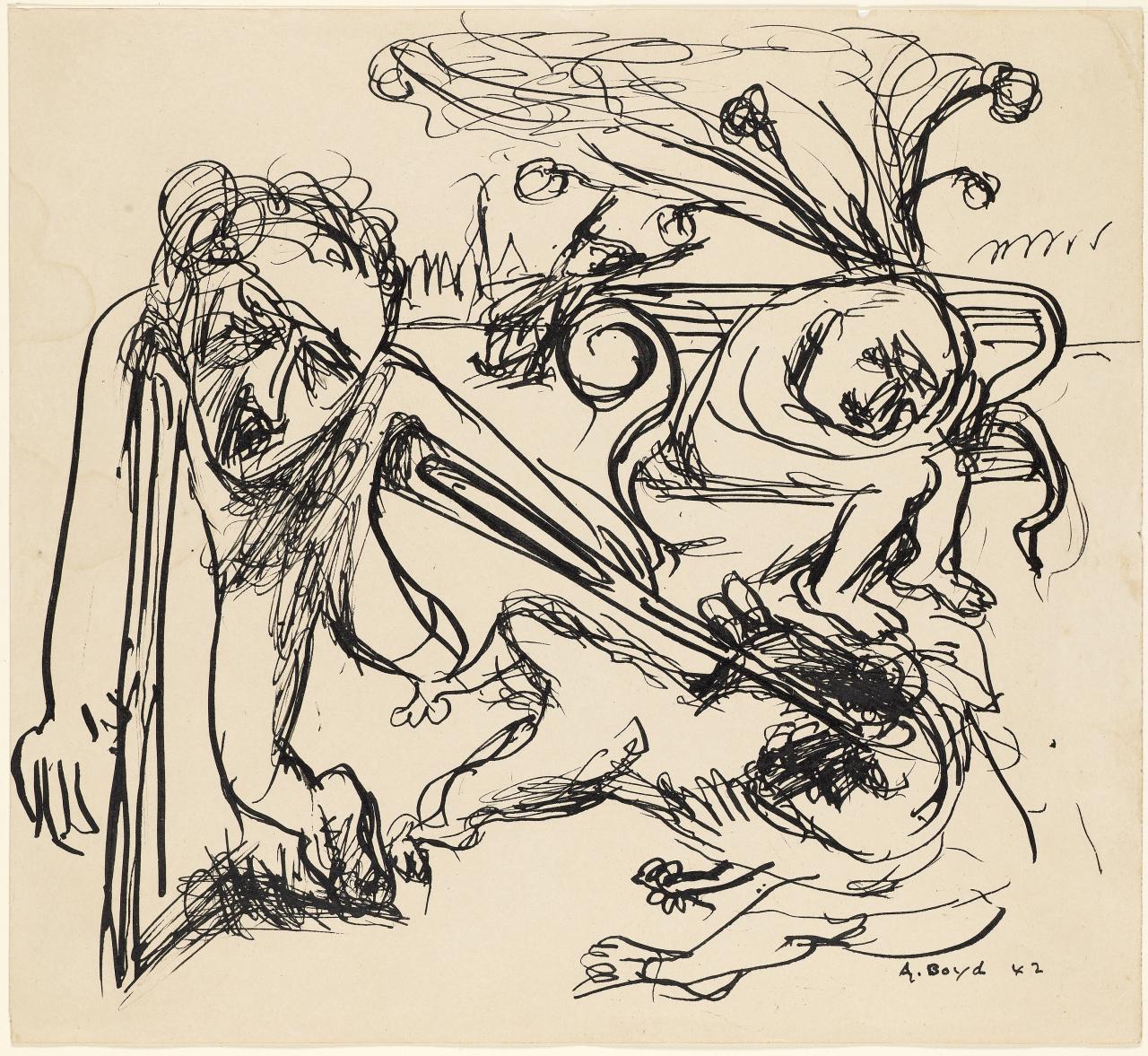 At this time Melbourne’s small art community was intensely stimulated by the confronting art and personal experiences of émigré artists such as Yosl Bergner and Danila Vassilieff; by the modern European art revealed to Melburnians at the Herald Exhibition in 1939; by the vehement political arguments raging in Australia; the reports of fighting overseas and the sudden, sordid transformation of wartime Melbourne. In response, young artists such as Arthur, Perceval, Lennie, Tucker, Hester, Bergner and others explored elements of Expressionism, Surrealism and Social Realism. While Perceval created powerful paintings to represent universal suffering, Arthur produced a disturbing series of drawings and paintings of real and imagined motifs, such as moths, cripples, flowers, entwined lovers and hybrid creatures, which formed the origin of his personal and ongoing iconography.