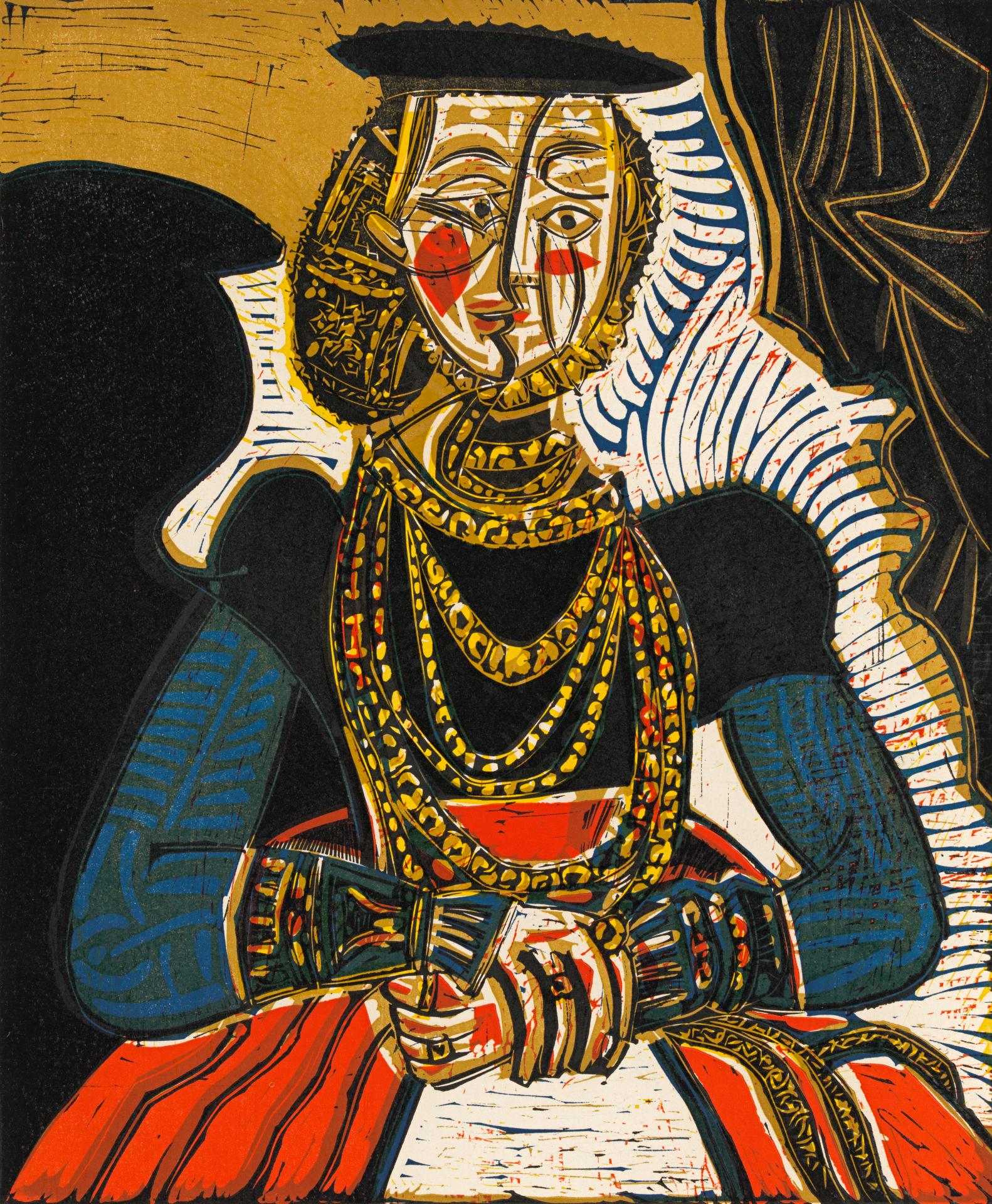 This iconic linocut, based on Lucas Cranach the Younger’s 1564 Portrait of a young lady at the Kunsthistorisches Museum in Vienna, is one of Picasso’s most famous and enduring statements in the graphic medium. It is an expressive improvisation on the sixteenth-century portrait, in which the artist brilliantly exploits the linocut’s inherent potential for intense colour and decorative abstraction of form. The dense, lustrous deposit of ink that is characteristic of the linocut is utilized, through the superimposition of five layers of colour, to create a tactile, painterly surface.