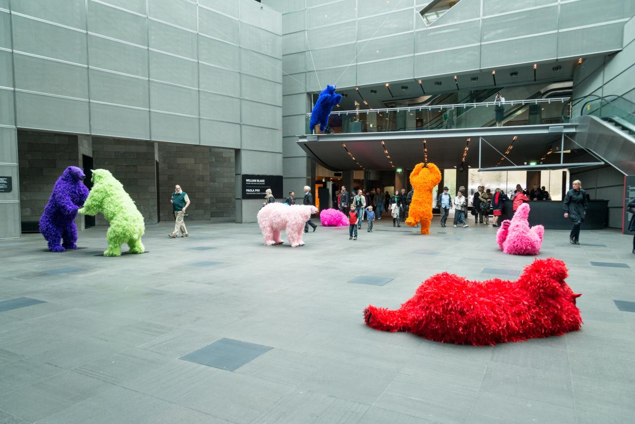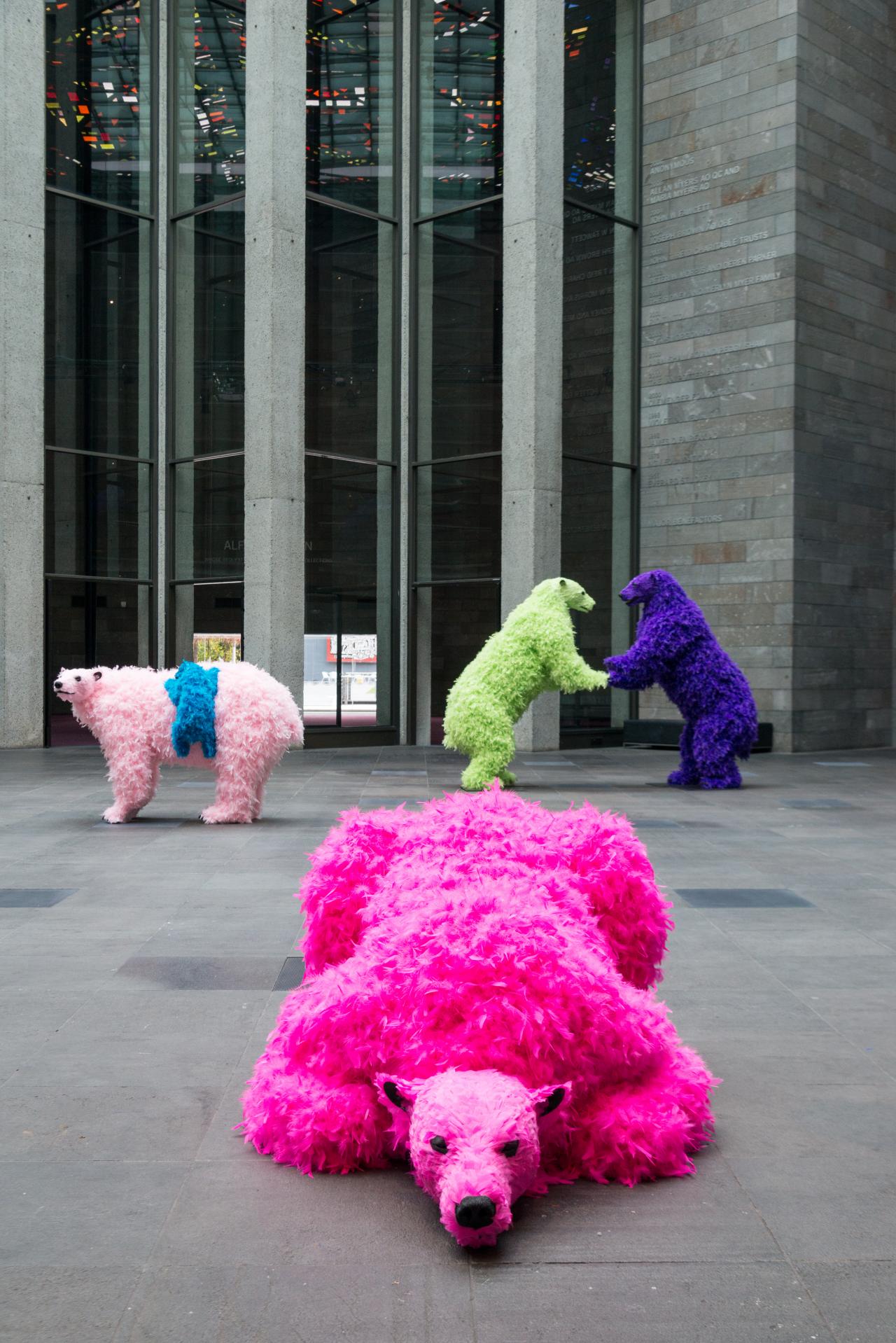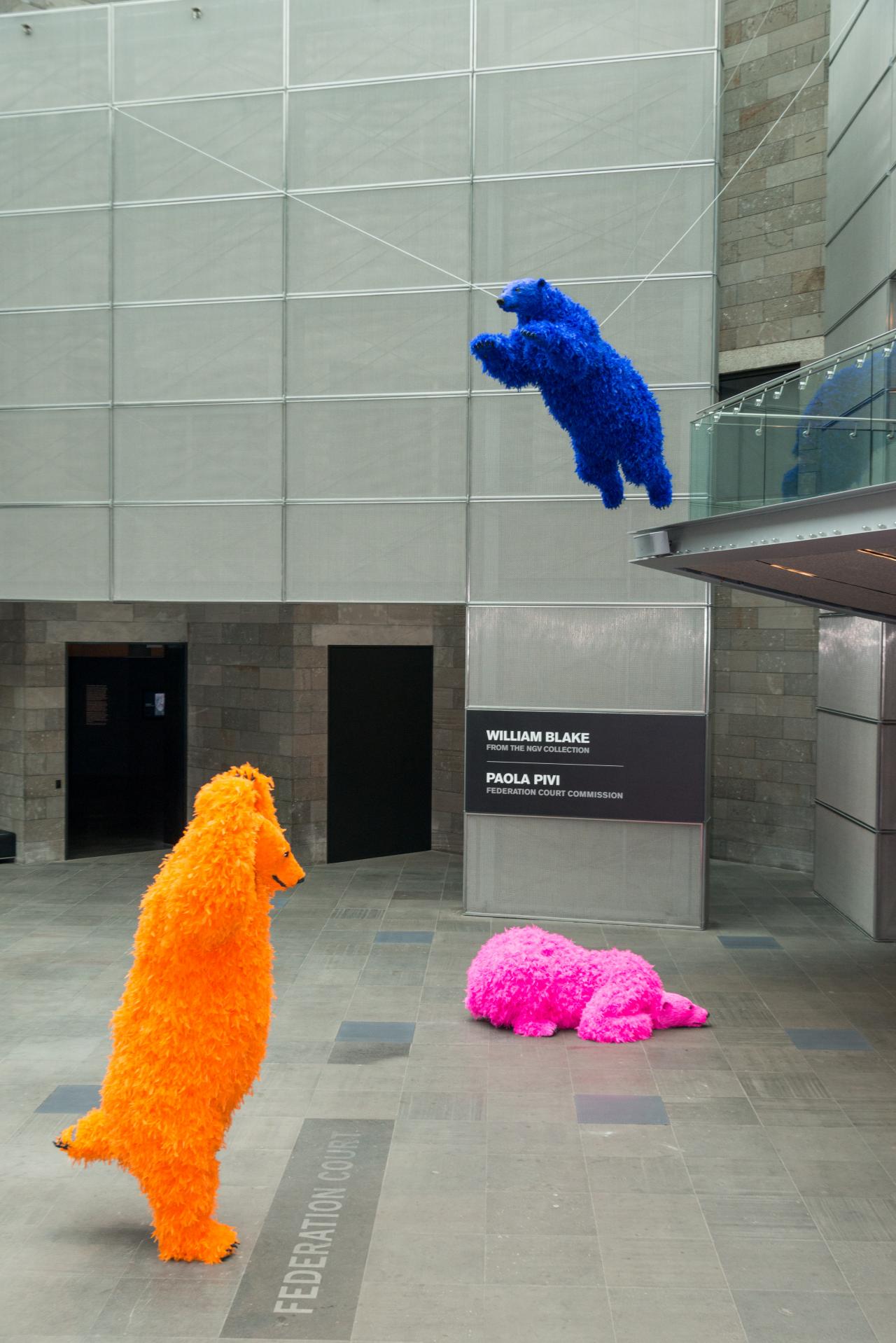 Continuing a recent series of major commissions by leading international artists for Federation Court at NGV International, Paola Pivi’s You started it … I finish it is an installation encompassing eight life-size sculptures of polar bears adorned with neon-coloured feathers. These flamboyant figures playfully occupy the space of Federation Court, greeting visitors, posing and frolicking: one bear leaps from a balcony; others approach one another as if to dance or engage in deep philosophical conversation; while others recline in joyful, carefree abandon.