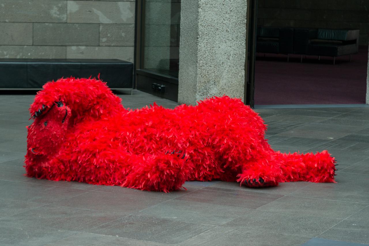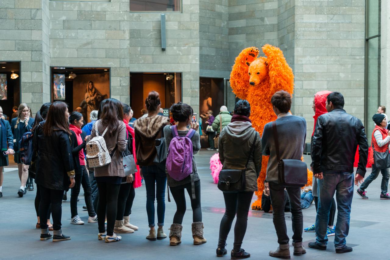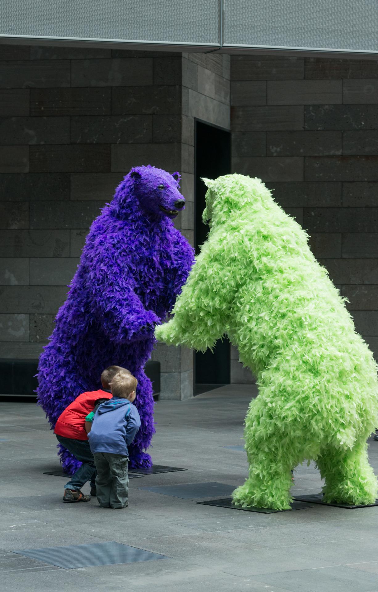 Continuing a recent series of major commissions by leading international artists for Federation Court at NGV International, Paola Pivi’s You started it … I finish it is an installation encompassing eight life-size sculptures of polar bears adorned with neon-coloured feathers. These flamboyant figures playfully occupy the space of Federation Court, greeting visitors, posing and frolicking: one bear leaps from a balcony; others approach one another as if to dance or engage in deep philosophical conversation; while others recline in joyful, carefree abandon.