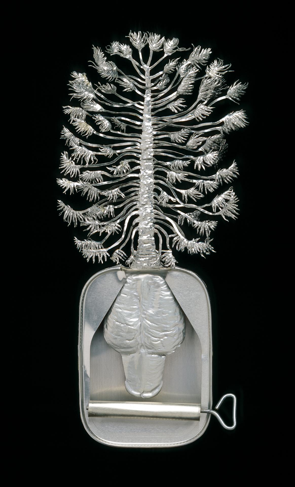 Paradisus Terrestris entitled has art historical referents in examples of colonial decorative arts. For nineteenth-century goldsmiths and silversmiths, most of whom were European immigrants, Australian native flora and fauna provided a bizarre and diverse stock of new decorative forms. Hall’s inclusion of Aboriginal names (in consultation with indigenous peoples) in conjunction with Latin and common plant names refers to the colonial appropriation of land, and to laying claim to land through language. ‘… Entitled’ refers specifically to concepts of ownership, and situates Hall’s virtuoso suite of sardine cans squarely within the discourses of postcolonialism.