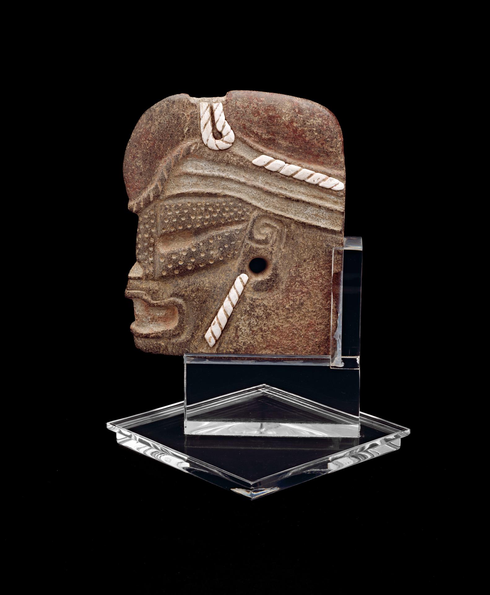The person stands within a raised border frame that curves diagonally upward, terminating in a scroll. Along the upper edge five rectangles represent the customary feather crest. The base has been cut so that the palma can be placed securely on a yoke and, as such sculptures were not meant to stand without a support, it is now mounted on a perspex stand. The person’s head and tall headdress are alike on each side. Above the vertical incisions that indicate the hair is a rectangle with three square elements, marked by a small central pit. These are the traditional roundels, or jade beads, carved in this instance in angular fashion. Three roundels in a frame are an attribute commonly found on Teotihuacan rain god images, and thereby denote the close cultural connections that Teotihuacan maintained with the Gulf Coast. Above the rectangle is a conventionalised serpent head with a backward curved scroll behind the reptile’s eye (shown only as a small rectangle). A taller scroll in front represents the nose. From it rise two long feathers that are bent back.