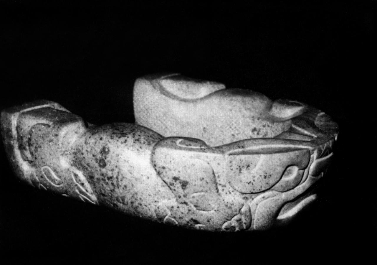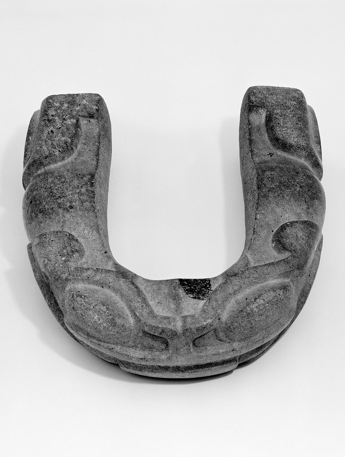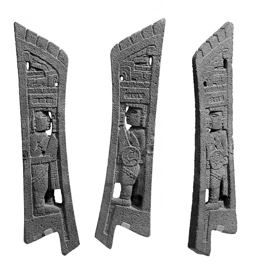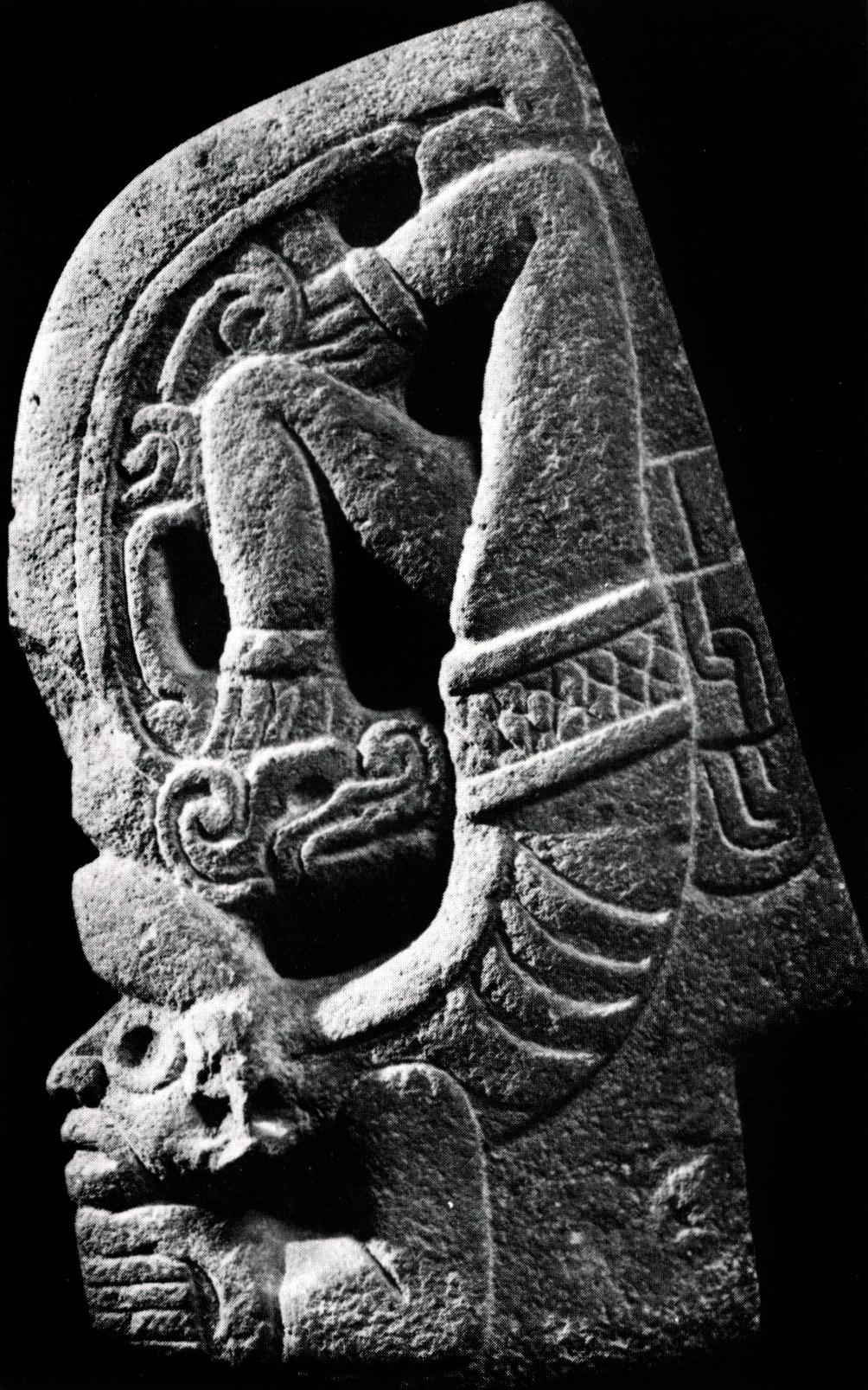 In Veracruz the hachas were replaced in the Late Classic period (A.D. 700–1000) by the so-called palmas. These are tall, fan-shaped sculptures that taper toward the bottom. Like the crested thin heads, they are not intended to stand freely without support. A relief carving on a wall of a large ball court at El Tajin shows how the palma, or palmate stone as it is sometimes called, was attached to the stone yoke by two dignitaries (fig. 13). In her pioneering study of the three categories of sculptures related to the ball game cult, Proskouriakoff11 Tatiana Proskouriakoff, ‘Varieties of Classic Central Veracruz Sculptures’, Carnegie Institution of Washington, Publication 606, Contributions to American Anthropology and History, no. 58, 1954. notes that palmas are as variable in form and decoration as the hachas. She classifies the more ornate palmas (which are by no means abundant) into four groups, one of which includes laterally flattened palmas, like the one recently acquired by the National Gallery of Victoria, Melbourne (fig. 14).