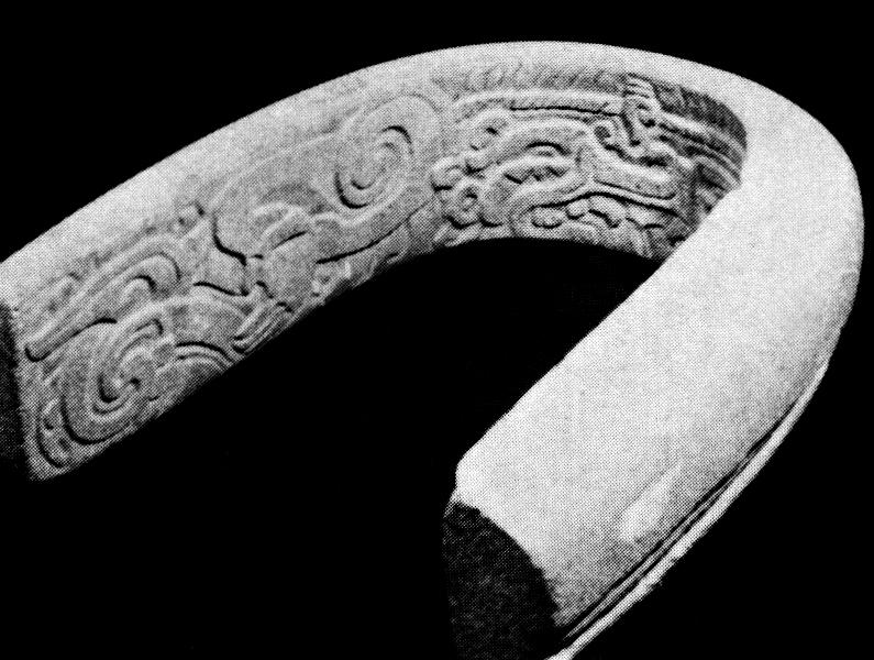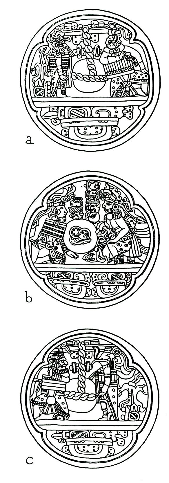 On the right side of the severed head is another sacrificed player, kneeling like the executioner, with a face inscribed on his knee to indicate the protective knee pad. His right hand and wrist are covered with bandages representing the glove. From the elongated neck emerge two heads, one to the right, the other to the left, each with a peculiar elongated nose turned downwards. That these heads are severed is indicated by a special sign, a roundel with a volute above and below, which corresponds to the Maya glyph T61 or T62 (according to Thompson’s catalogue).15 J. Eric S. Thompson, A Catalog of Maya Hieroglyphs, University of Oklahoma Press, Norman, 1962. In Maya hieroglyphic texts this glyph signifies hol, ‘end, termination’, and its position behind the severed head is an accurate explanation of the result of the sacrifice as far as the victim is concerned.16 The decapitation sign occurs also in ball game scenes on ceramic relief-decorated bowls of the Rio Blanco Complex of south-central Veracruz. See Hasso von Winning, ‘Los decapitados en la cerámica moldeada de Veracruz’, Indiana, 6 Gedenkschrift Walter Lehmann, Teil I, Berlin 1980, pp. 23–35; and ‘Der Jaguar und sein Menschenopfer auf Reliefgefässen aus Veracruz’, Tribus, Linden-Museum, Gedenkschrift Bodo Spranz , in press.