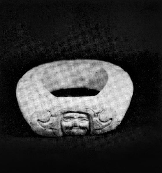 On the curved front of the yoke was placed a thin crested stone head with a triangular notch in back, cut at an obtuse angle, So that it could be properly fitted. One of our examples (fig. 11) shows this notch on an hacha of an acrobat who also wears the thick woven belt.