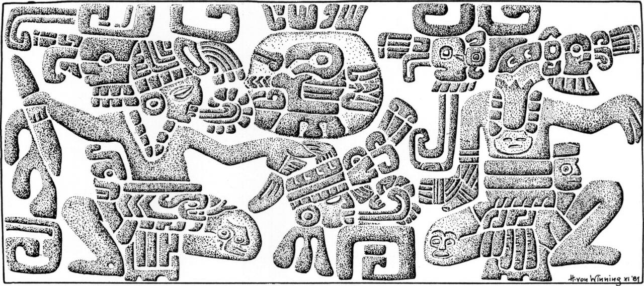 If these interpretations sound somewhat arbitary to those unfamiliar with the subject matter of Classic Mesoamerican art, it can be said that they are derived from comparative analyses of the iconographic repertory which is composed of conventionalised images and signs. An understanding of their form and meaning, on the basis of contextual associations, has been reached in many but certainly not all instances, through systematic studies by art historians over the past decades.