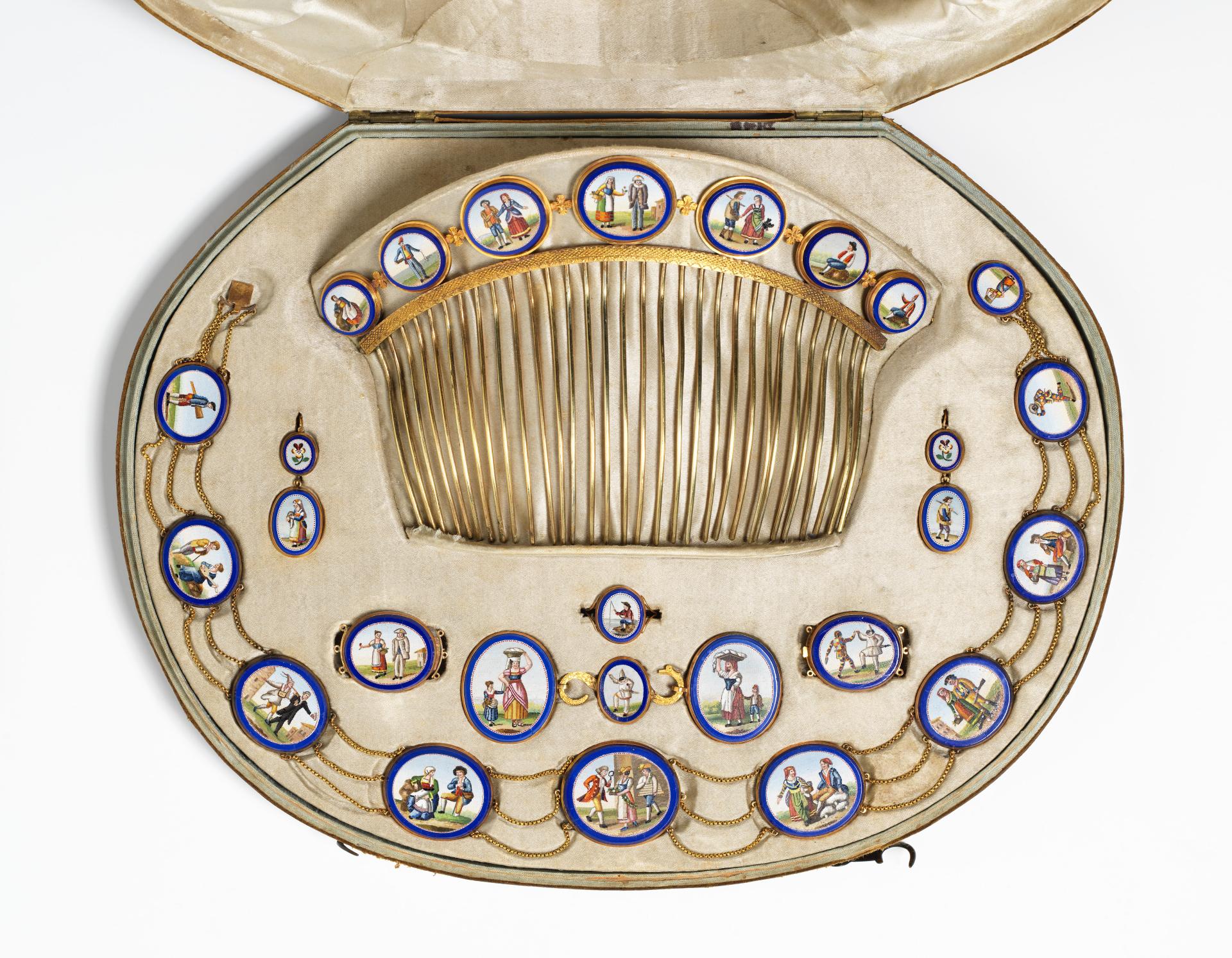 Una parure è una serie di gioielli abbinati, spesso composta da una collana, un diadema, una spilla, bracciali e orecchini, pensati per essere indossati contemporaneamente. Questi set coordinati erano molto popolari nel XIX secolo e venivano realizzati con metalli e pietre preziose così come con materiali unici come il corallo e, in questo caso, il micromosaico. Questa parure comprende ventisette pannelli in micromosaico che raffigurano scene e figure della Commedia dell’Arte, una forma di teatro comico italiano nata nel XVI secolo. Poiché opere come queste venivano create appositamente per essere vendute ai turisti, spesso raffiguravano quelle che potevano essere considerate come scene classiche italiane. Oltre alla Commedia dell’Arte, le parures a micromosaico raffiguravano spesso anche rovine di antiche città e scene pastorali italiane.