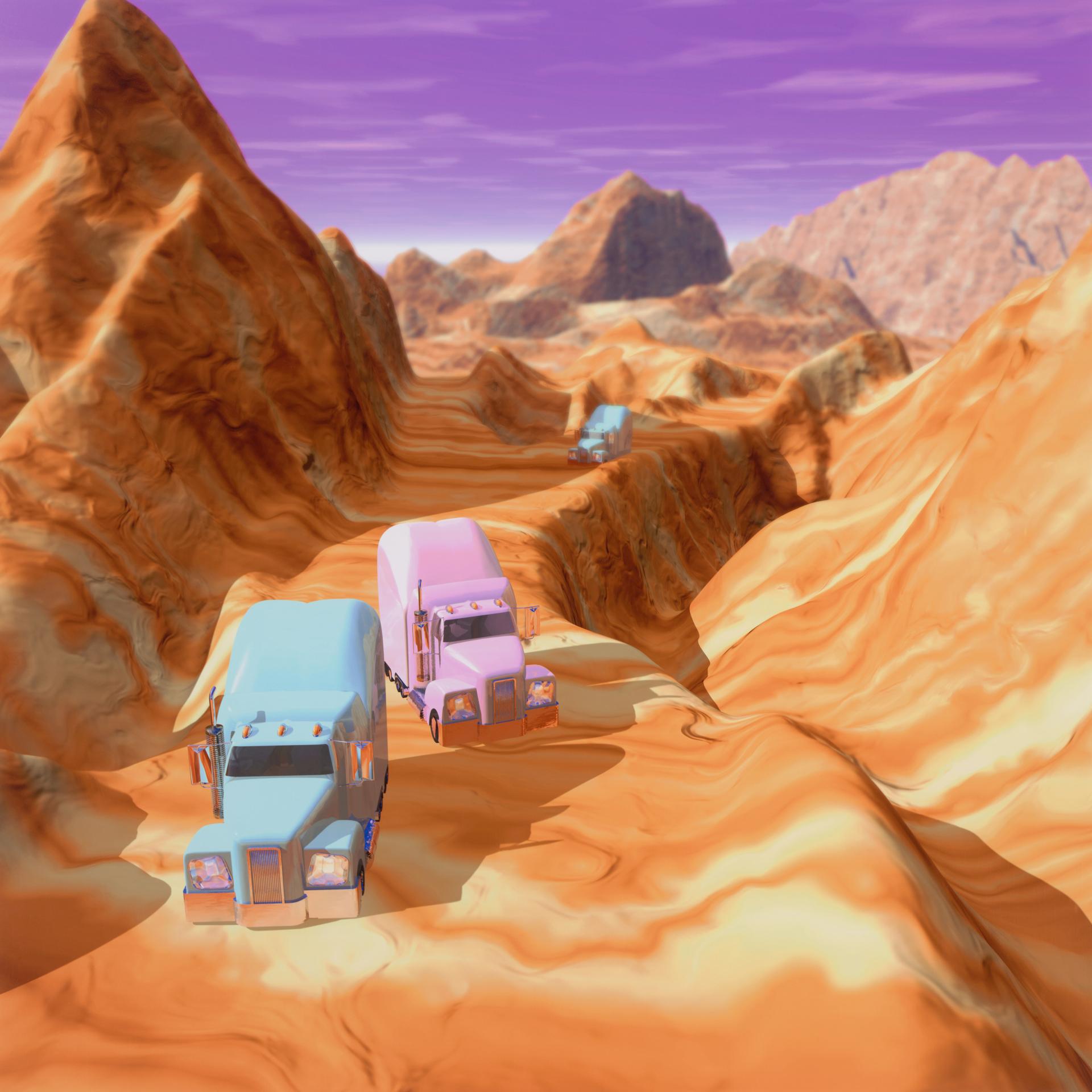 The landscape behind the babies also seems to be the perfect, natural habitat for cars, with no greenery for them to pollute. However, the sleek, sweet colours of the trucks and the digital mountain-scape in which they roam are both inorganic and harmonious, or is it just that this anthropomorphism makes nature gleam artificially? In advertisements – especially for heavy-duty off-road machines – the object for sale is frequently placed in exotic or radically dangerous places to enhance their physical mobility and the potential mobility gained by owning one. Piccinini’s image shows a world not dissimilar to such product promotions, but one that is human-less. If these trucks could self-reproduce then, in this fantasy, Piccinini’s Desert rider would be an ad for them – perhaps marketing truck family holidays, or, in the world of perfect trucks, the image might evoke some type of truck utopia or form of pin-up truck beauty. Indeed, such a proposition isn’t far from the world of consumables Piccinini has already imagined in Psychotourism, 1966 and Psychogeography, 1966, also in the collection of the National Gallery of Victoria. The suggestion is humorous but laced with anxiety. This time it seems it is scientists rather than the writers of science fiction who are making dystopian claims, with Stephen Hawking predicting a future in which we are slaves to superintelligent machines.