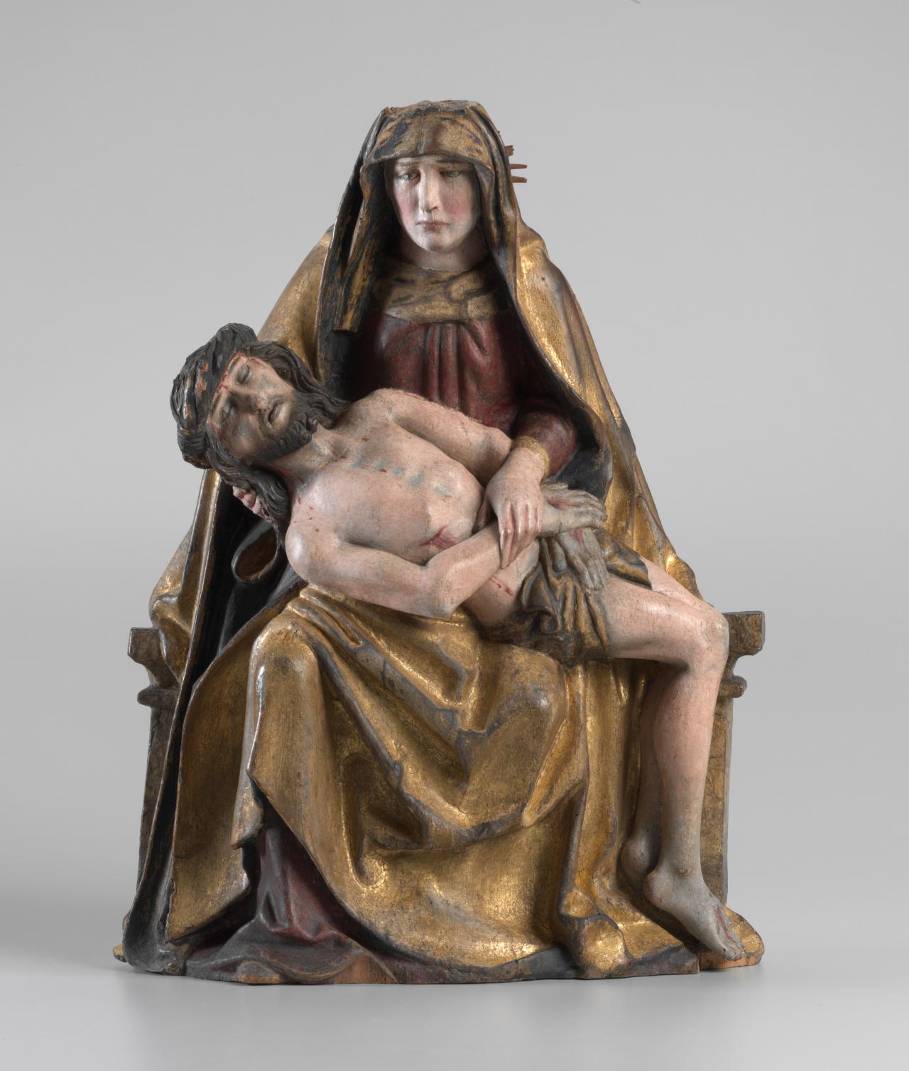 A pietà is a type of devotional image depicting the Virgin Mary mourning over the body of the dead Christ and was first developed in Germany at the beginning of the fourteenth century. It is an example of an Andachtsbild – an image used to form a highly focused and emotionally powerful vignette for prayer and contemplation. References to the pietà are seen throughout art history, including very recently, GONE, 2019, by KAWS. This evocative early sixteenth-century pietà(pictured) in the NGV Collection is carved in limewood with gilding and polychrome (multiple colours) on its surfaces. Originating from Germany, likely by an artist from southern Germany, a region known for this angular style of wood carving, this pietà was originally used for private devotional practices, with its back hollowed out to reduce shrinkage of the wood.