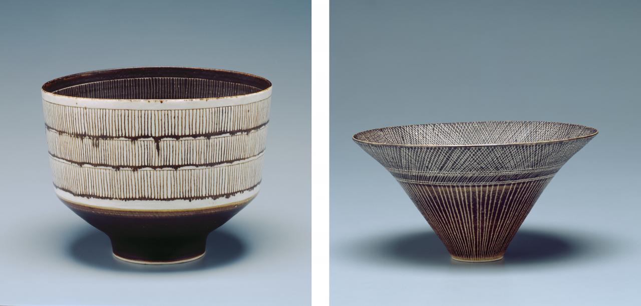The three wheel-thrown, porcelain bowls by Sheila Fournier (fig. 8) bear an obvious family resemblance and impress for their graceful simplicity and for the delicacy of the sharply-incised decoration which traces gliding circuitous paths the full span of the shallow interior. These lines converge, pass through the ovoid apertures in the walls of each bowl then resume their lyric journey across the gentle curvature of the outer surfaces. Possibly the more conventional of the ceramics so far discussed, these bowls by Sheila Fournier are, nevertheless, agreeably unassuming and particularly beautiful objects.