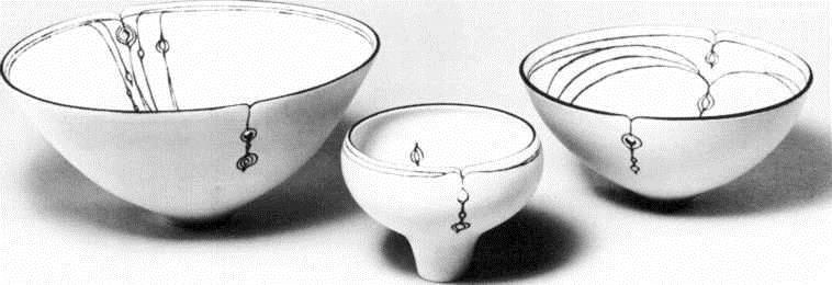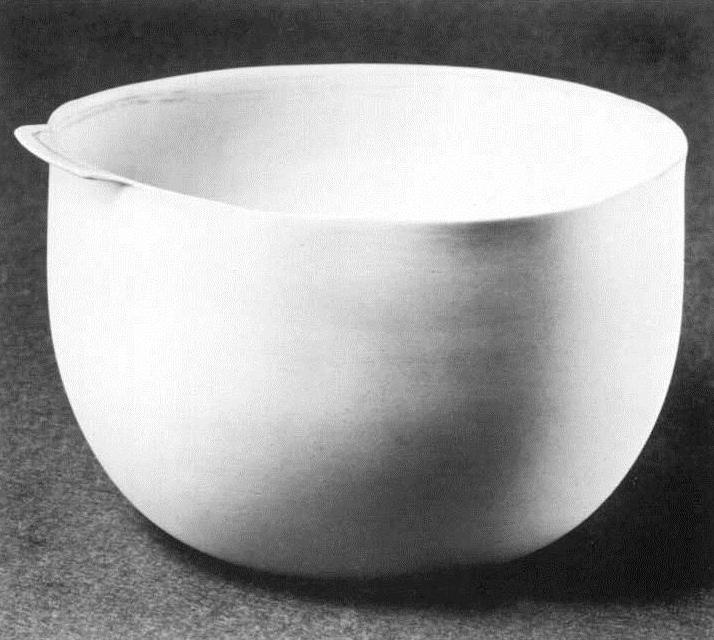 As one traces the course of English studio pottery it is not an easy matter to locate notable and sustained excursions into the complexities of porcelain manufacture, although it is quite obvious that a number of potters (with Bernard Leach prominent among them) have, from time to time, used porcelain clay with success. It also becomes evident that the outstanding potter in England to have worked consistently in porcelain and to develop a recognisable and highly-personalised idiom in the use of that clay is Lucie Rie. Born in 1902, Lucie Rie spent her formative years in Second World War Vienna where she was exposed to the functionalist principles of design which were receiving strenuous promotion at the time. Amongst those ceramics for which she is most admired today are the thin-walled bowls in raw-glazed porcelain (fig. 7). With sensitive and tightly-controlled bands of sgraffito decoration they exhibit a sophisticated precision of form and an apparent vulnerability of fabric.