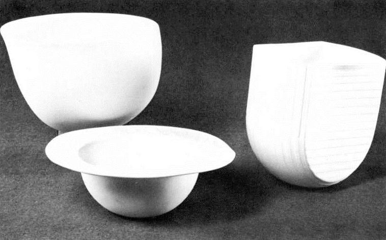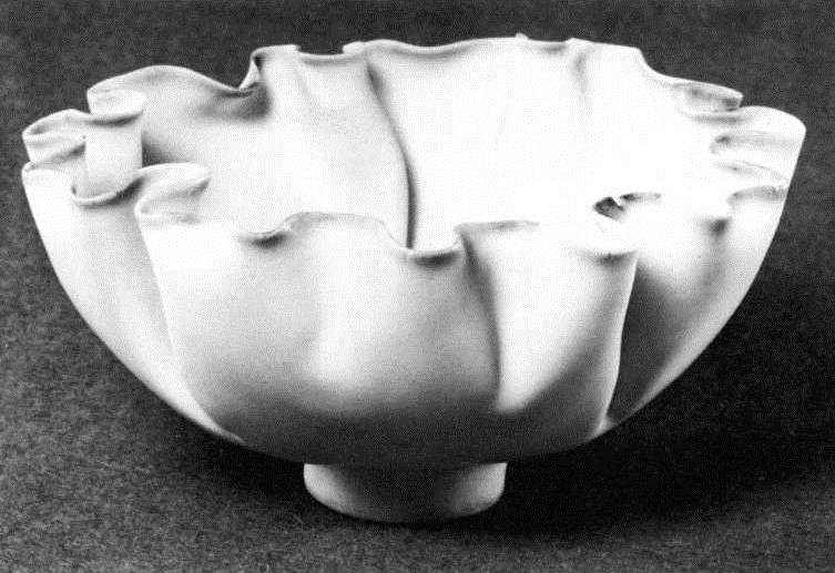 The porcelains of Mary Rogers can be interpreted, with justification, as celebrations on an intimate scale of the phenomenal process of germination and growth or more generally, of the forces and rhythms of nature. Her two larger bowls (fig. 1 & fig. 2) spring jubilantly from their short, narrow feet and bloom into reasonably capacious but essentially decorative vessels. The largest (fig. 1) is astonishing for its elaborate convolutions, and together with its diminutive counterpart (fig. 3) is evocative of a certain billowy species of marine alga. The bowl (fig. 2) with a widely-flared rim suggests the shape of the lily flower and has deployed over its interior surface a flickering pattern of spiralling lines in pale-green and brown stipple which can be seen in soft silhouette through the clear-glazed walls.