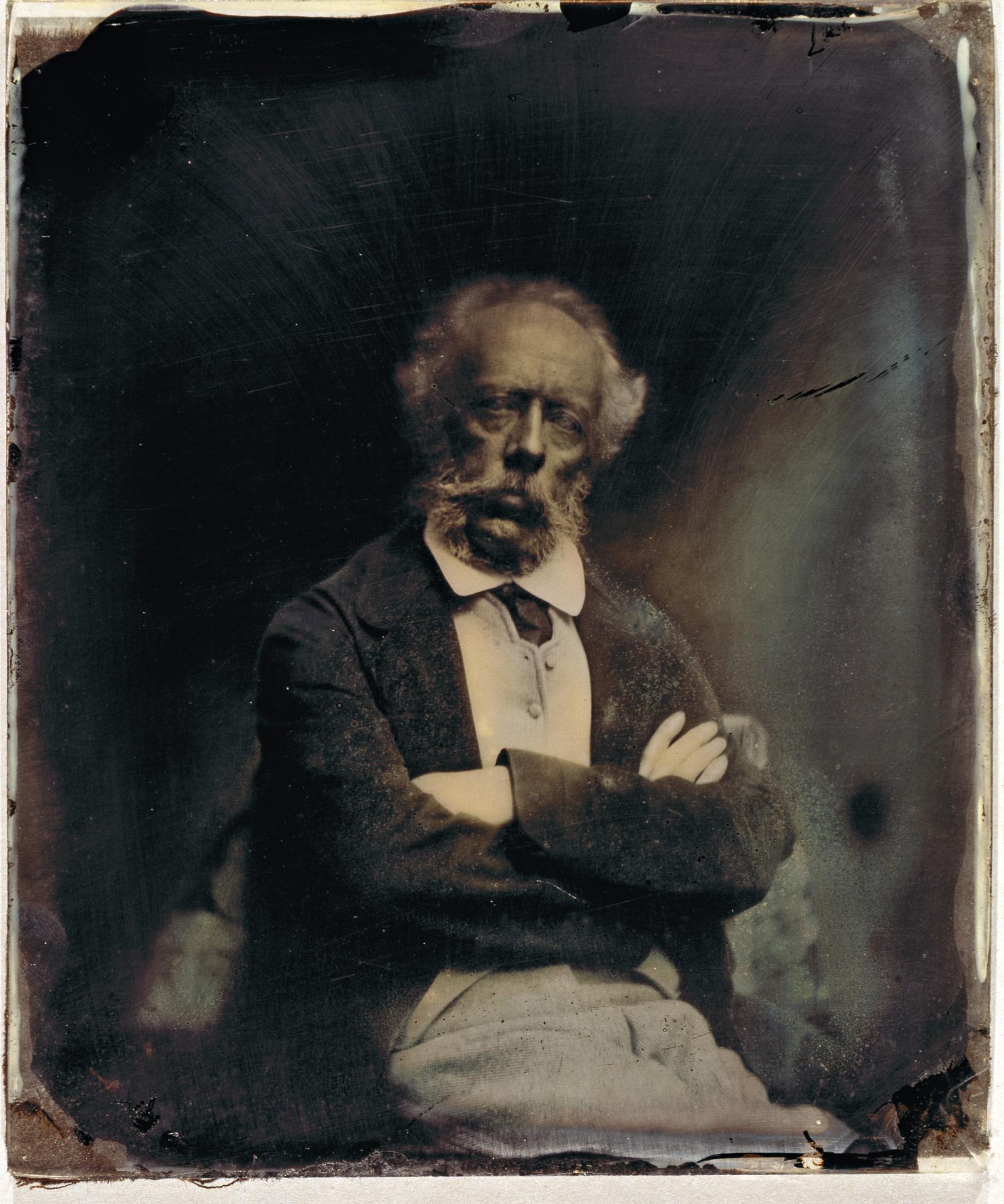 The photograph itself is almost austere in its composition, with none of the painted backdrops or props which characterise later commercial portraiture. Martens is posed simply, seated on a chair with arms crossed and head slightly tilted. He gazes directly into the camera with no attempt to smile or soften his appearance, revealing both an apparently forceful personality and a certain weariness – the latter indicative of the uncertain financial situation in which he frequently found himself.