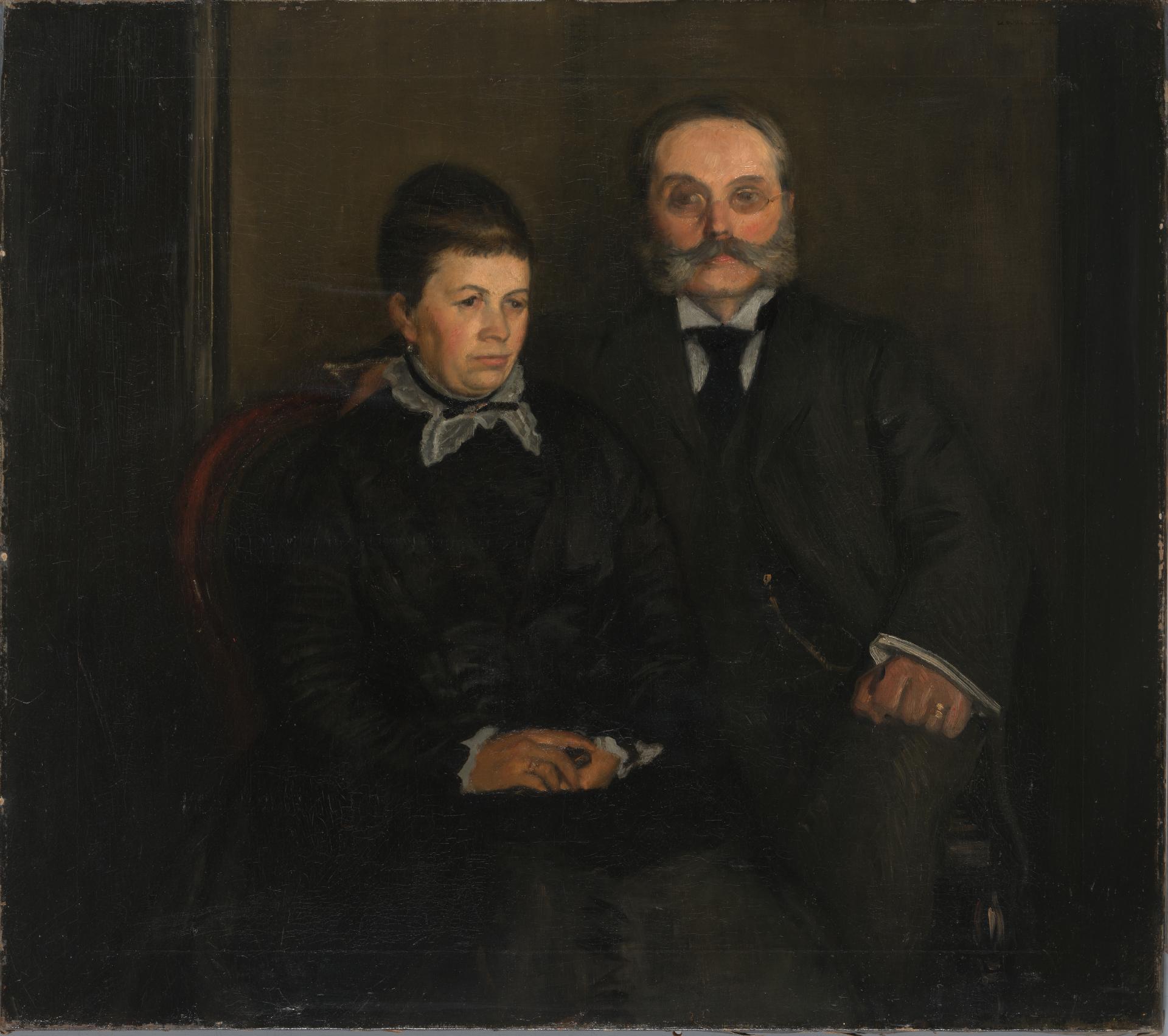 This is a very fine example of William Rothenstein's painting practice at a time when his art was achieving wide recognition in the English art world. In 1900, the year this work was painted, Rothenstein's painting The doll's house 1889–1900 (Tate, London) won a silver medal at the Paris Exposition. Rothenstein's work at this period was highly influenced by that of Edgar Degas, who had become very much a mentor to the English artist during his time in Paris in the preceding decade. The artist's parents, Moritz and Bertha Rothenstein, are shown here dressed formally and seated in an interior. The composition at first seems somewhat stern, reflecting perhaps their conservative Germanic background. The seeming formality of the couple's pose is softened however by the father's right hand, which reaches protectively around the shoulders of his beloved wife.