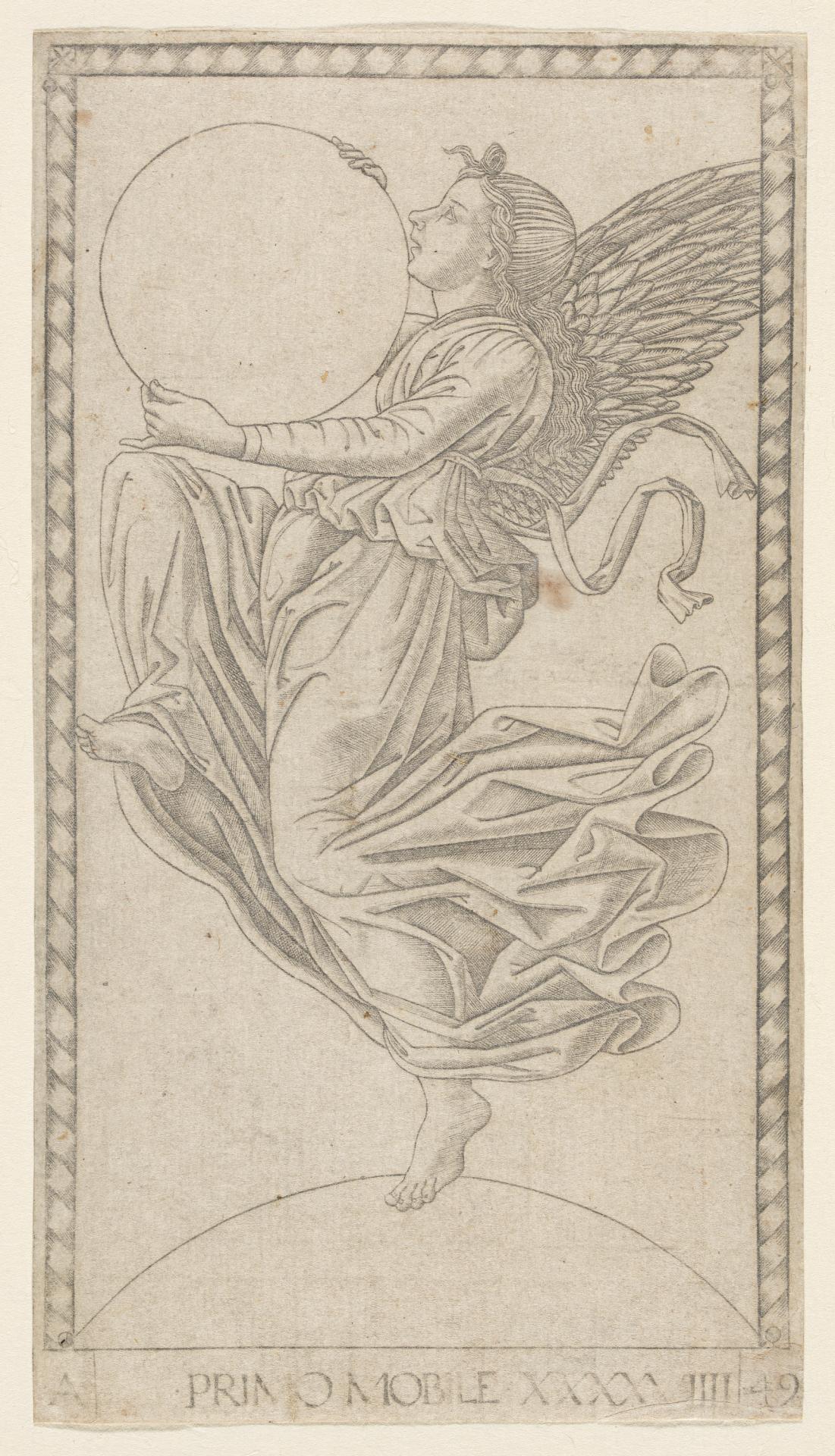 La funzione e la paternità dei Tarocchi della Serie E hanno presentato a lungo problemi affascinanti per gli studiosi. A causa della somiglianza di alcune immagini con le carte del mazzo dei tarocchi, la serie è stata tradizionalmente ritenuta essere un mazzo di carte da gioco. È ormai generalmente accettato, tuttavia, che la serie sia una rappresentazione dell’universo che era forse intesa come un gioco di istruzioni. Le cinquanta stampe presentano una visualizzazione della cosmografia medievale e rinascimentale, secondo la quale l’universo era visto come una “scala dell’essere” gerarchicamente strutturata che si estendeva da Dio al vertice fino alla più bassa stazione umana del mendicante. Il Primo Mobile occupa la seconda posizione in questa gerarchia e appartiene al sottogruppo di dieci stampe che raffigurano la disposizione dei pianeti e delle sfere celesti così come intesa a quell’epoca. Abitando la nona sfera celeste di questo sistema, il Primo Mobile attinge all’energia infinita di Dio, o Causa Prima, per girare intorno alla Terra a velocità infinita e mettere in moto le altre otto sfere planetarie. Per rappresentare questa forza cosmica, l’artista ha raffigurato una figura alata che salta nei cieli, la cui posa suggerisce un movimento violento, mentre i nastri e i panneggi svolazzanti evocano la sua immensa velocità. Sebbene l’artista abbia attinto a immagini precedenti per molti dei disegni di Tarocchi, non si conoscono precedenti per questa visualizzazione estremamente aggraziata ed elegante di un’idea cosmica.