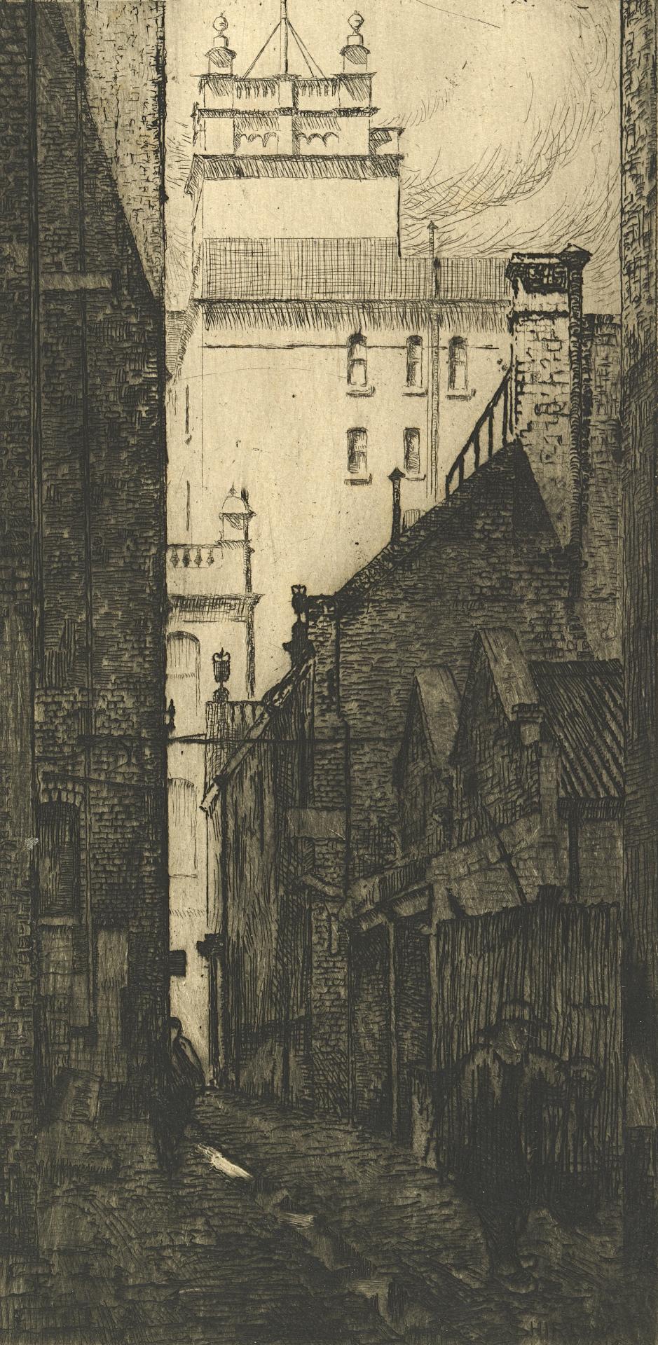 However, the prints with the greatest impact on local artists were the nineteenth-century etchings. Meryon – on whose shoulder, according to Lindsay, ‘the whole modern [etching] “Revival” is borne’29 L. Lindsay, ‘The Art of Etching’, Art in Australia, no. 9, 1921, n.p.. (fig. 3) – exerted a lasting influence on the etching manner of Shirlow, in terms of compositional preference and approach to subject matter, as well as technical effect. Shirlow’s portrayals of city lanes clearly reflect Meryon in their pinched narrowness, their exaggerated height and their oppressive and clearly articulated shadows (fig. 4). But Shirlow’s depictions are not invested with emotional drama and he was never able to match Meryon’s technical skills in controlling tonal gradations. Instead, he used selective wiping and plate tone to structure the disposition of tones in the image.30 Writing in the Melbourne Herald, 31 August 1918, Shirlow also acknowledged his debt to Whistler: ‘My career as an etcher … began in 1893. In that year the Victorian Government purchased a number of Whistler prints which were hung in the National Gallery. At that time I was a student at the Gallery, and Whistler’s exquisite work made such a profound impression on me that I was not satisfied until I had obtained some copper plates and set to work on them’.