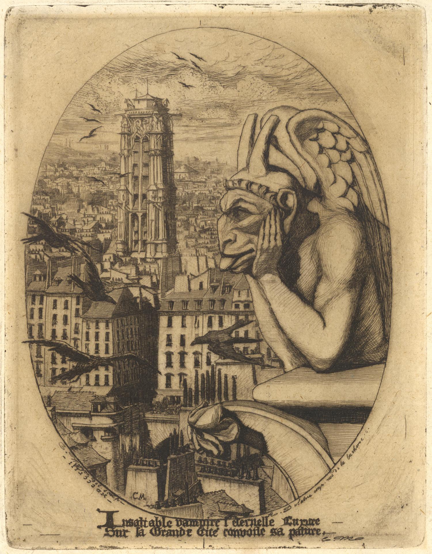 In its militant purposefulness, O’Dowds rhetorical and tortuous style veers towards caricature, but its use of metaphor, and its conception of the city as a live and threatening organism, recall Meryon’s views of Paris and, particularly, his mocking vampire, Le Stryge (fig. 12).
