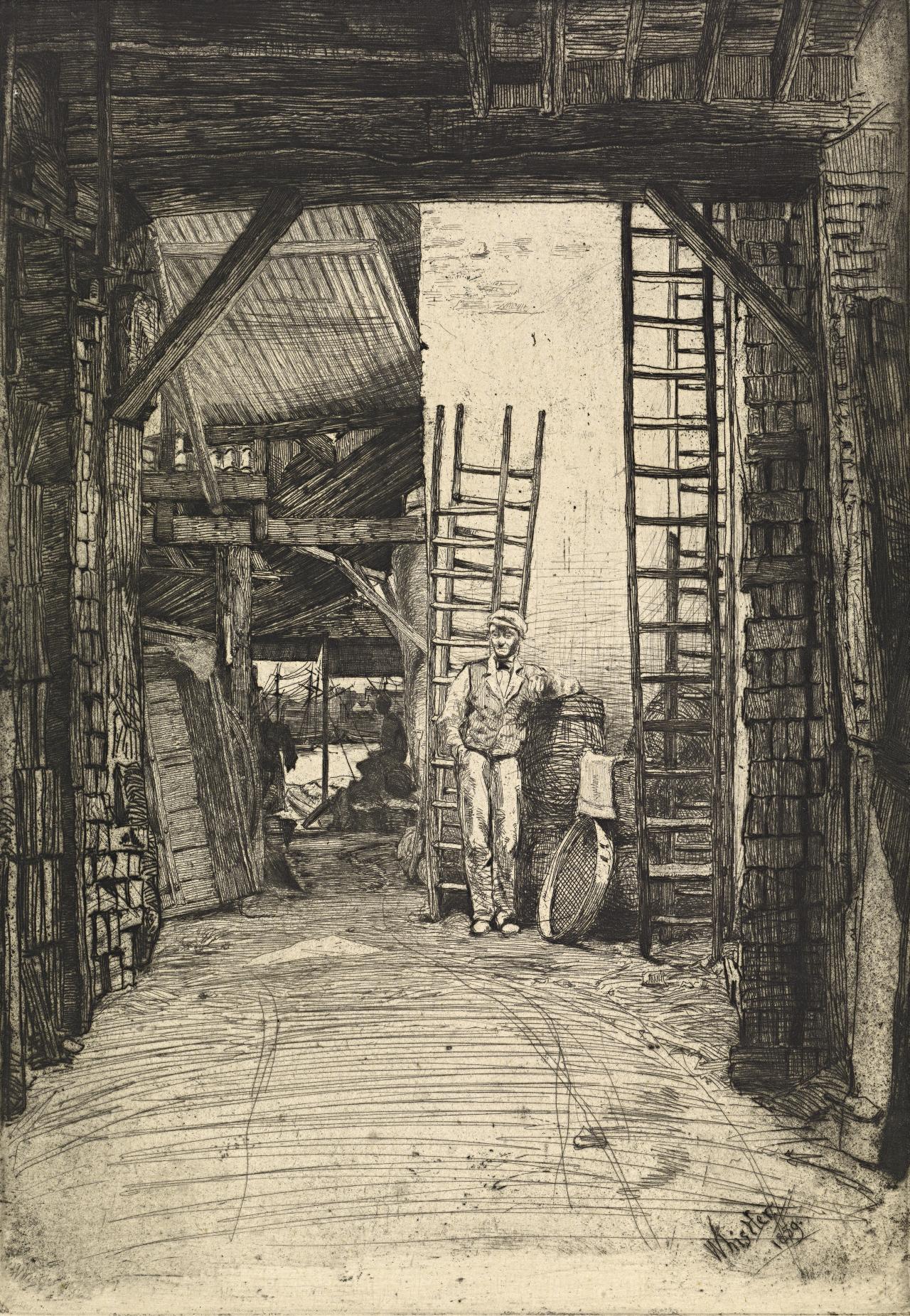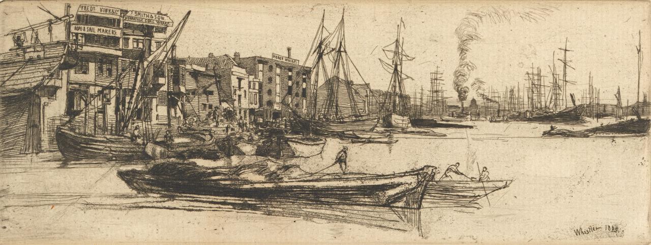 James McNeill Whistler (American/British, 1834–1903): The Thames set, published 1871, comprising: Thames warehouses, 1859 (Kennedy 38 ii); Old Westminster Bridge, 1859 (K.39 ii); Limehouse, 1859 (K.40 iii); Eagle Wharf (Tyzac, Whiteley and Co.), 1859 (K.41, only state); Black Lion Wharf, 1859 (K.42 iii); The pool, 1859 (K.43 iv); Thames police (Wapping Wharf), 1859 (K.44 ii); The Lime Burner, 1859 (K.46 ii); Becquet (The fiddler), 1859 (K.52 iii); Rotherhithe (Wapping), 1860 (K.66 iii); Millbank, 1861 (K.71 iii); The little pool, 1861 (K.74 viii); Early morning, Battersea, 1861 (K.75, only state); Old Hungerford Bridge, 1861 (K.76 iii); The Forge, 1864 (K.68 iii); Chelsea Bridge and Church (1870–71) (K.95 vi).
