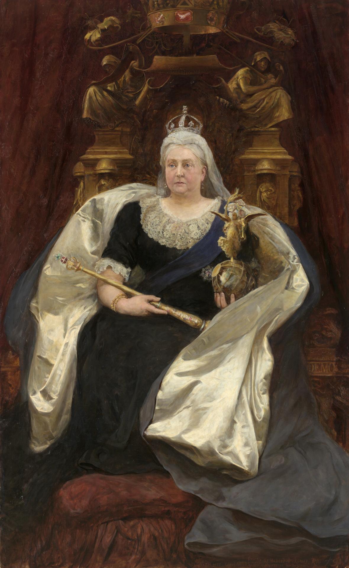 In 1889 the NGV’s Trustees asked the Governor of Victoria, Sir Henry Loch, during a visit he was making to England, to enquire whether Queen Victoria would sit for a portrait to be commissioned by the NGV. Hubert Herkomer was suggested for this task, or any other artist of her choice. The Queen declined to sit for Herkomer, so instead Sir Henry Loch proposed that a Jubilee portrait of the monarch be copied instead.1Edmund La Touche Armstrong, The Book of the Public Library, Museums, and National Gallery of Victoria. 1856–1906, Ford & Son, Melbourne, 1906, p. 60. It was likely that Loch was referring to the official State portrait that Queen Victoria had commissioned in 1885 from one of her favourite artists, Heinrich von Angeli (Royal Collection Trust, London, RCIN 403405). Had Herkomer worked from this portrait by von Angeli, he would have only been one step removed from the sitter, painting from a likeness for which the Queen herself had posed.