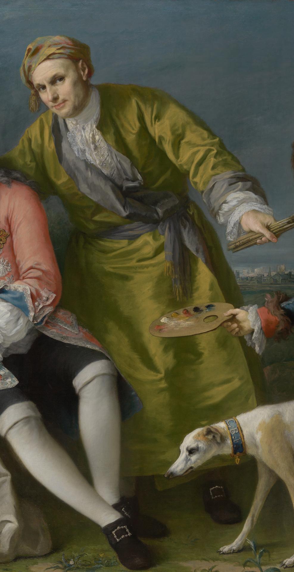 To understand how the painting functions to bring together those that Farinelli considered family, a brief description of it is warranted. Amigoni’s conceit is to paint the group as if they have been interrupted while rehearsing outdoors in a garden, with Farinelli, Castellini and Metastasio seated. Behind them is a woodland, and in the far distance a city, presumably Madrid. Unusually it includes the artist himself who is standing and strikes an exotic note in his silk turban and dark green silk banyan, a loose gown fashionable in the eighteenth century, which was worn in informal domestic settings (below).11Brandon Brame Fortune, ‘Studious men are always painted in gowns’: Charles Willson Peale’s Benjamin Rush and the question of banyans in eighteenth-century anglo-American portraiture’, Dress, vol. 29, no. 1, 2002, pp. 27–40. In spite of the luxurious material, it is apparently his work attire as in his left hand he holds paint brushes, clearly identifying his profession. His palette is held out to him by a pageboy dressed in a hussar’s uniform on the extreme right of the painting, who is accompanied by a dog with Farinelli’s initials on its collar (below). Amigoni leans forward towards the viewer with a slight smile, while placing his arm around Farinelli to rest his hand on his shoulder. With no canvas in sight, except the one the spectator observes, it is as though with a nod to Diego Velázquez’s Las Meninas, he has reversed his normal position in front of the canvas, to appear where the group is posed, in order to be included.