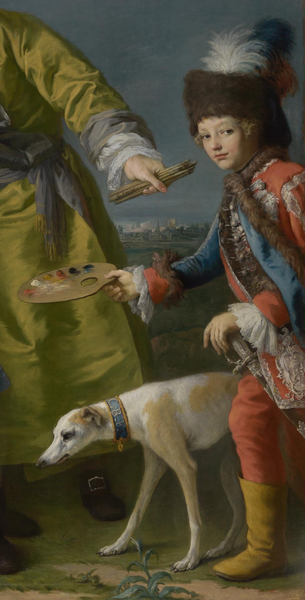 The high fur hat, he noted, is Hungarian, and the facial features resemble those of Joseph. However, the Spanish court enjoyed a close relationship with the court of the Holy Roman Emperor in Vienna, because both were ruled by two branches of the same family. It would not be unusual for Austrian pageboys to be at the court in Madrid. It would however be highly unusual for an Austrian crown prince to hold out a palette deferentially for a painter. Furthermore, for Heartz’s hypothesis to work, Farinelli would also needed to have obtained a portrait of the crown prince from Vienna, where he resided. The obvious person to entrust with such a mission would have been Metastasio, who was at the court in Vienna. He could, for example, have asked Metastasio to arrange this at the same time as he commissioned a portrait of himself, and Heartz in fact argues that this is what may have occurred.33Heartz, 2004, p. 110. But there is no such mention in the correspondence, and Metastasio describes in laborious detail all the favours he undertakes for Farinelli. It also seems unlikely that Farinelli would have commissioned a portrait of the crown prince as he had no special relationship with him. It is more likely that the pageboy, like the dog with Farinelli’s initials on its collar, is present in order to accentuate the general impression of Farinelli’s high social status at the royal court and his affluence.