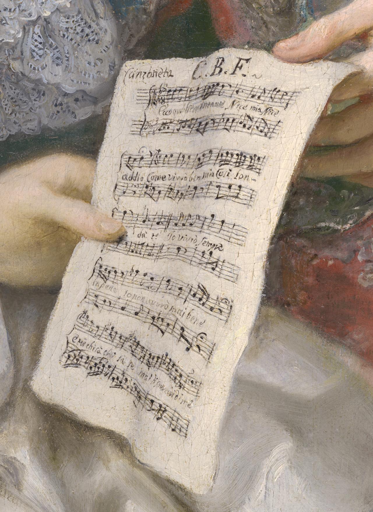 They jointly hold a small sheet of music, which identifies them as singers. The score is a setting of the canzonet ‘La Partenza’, by Metastasio, in which he bids farewell to Nice. Metastasio sent text and music to Farinelli in January 1750, but what we see in the painting is a version set to alternative music by Farinelli as it is inscribed with the initials ‘C. B. F’.15Carducci, letter CLXXVII, pp. 325–6: ‘Per sollevarvi dalla noia della lunga lettera eccovi una canzonetta all’occasione della partenza di Nice. … La musica è ordinaria, et è mia: ma chi voglia cantarla con un poco d’espressione ci troverà quello che bisogna per persuadere una Nice’. (To relieve you from the tiresomeness of this letter I send you a canzonetta on the departure of Nisa … The music is common, and my own; but whoever sings it with a little expression, will find it sufficient to vanquish a Nisa.) Burney’s translation, in Charles Burney, Memoirs of the Life and Writings of Abate Metastasio, 1, G. G. and J. Robinson, London, 1796, p. 344.